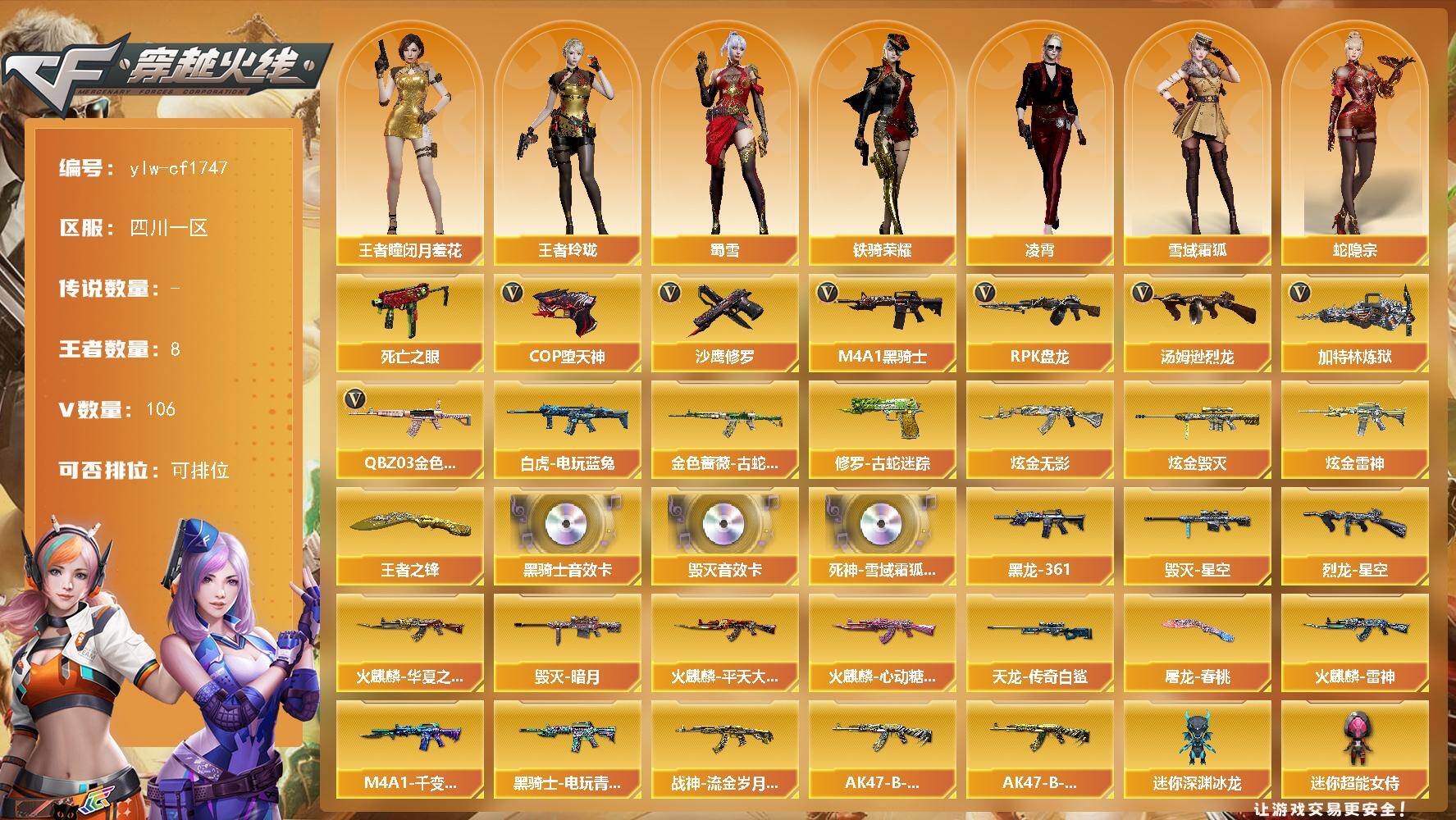 [15738974]四川一区-106V-8王者-3炫金 【热门武器】:QBZ03-金色蔷薇,金色蔷薇-古蛇迷踪,修罗-古蛇迷踪,死亡之眼,白虎-电玩蓝兔,M4A1-黑骑士,汤姆逊-烈龙*6,RPK-盘龙,加特林-炼狱*6,COP-堕天神,沙鹰-修罗*3 【王者炫金武器】:王者之锋,炫金无影,炫金雷神,炫金毁灭 【音效卡】:M4A1-黑骑士音效卡,Barrett-毁灭音效卡,死神-雪域霜狐-怀旧音效卡 【皮肤】:烈龙-星空,火麒麟-雷神,火麒麟-华夏之心,火麒麟-平天大圣,火麒麟-心动糖果,毁灭-暗月,毁灭-星空,M4A1-千变-孔明皮肤,M4A1-黑龙-361,黑骑士-电玩青兔皮肤,战神-流金岁月皮肤,AK47-B-常胜将军-刘备,AK47-B-常胜将军-孙权,AWM-天龙-传奇白鲨,屠龙-春桃 皮肤 【角色】:凌霄,王者-瞳-闭月羞花,王者玲珑,雪域霜狐,蛇隐宗,奇洋探员,乔伊教练,云海玲珑,暗夜-X,北极狐-X,初恋灵狐,电竞少女,芳心审判者,飞虎队-X,风暴女,嘉年华灵狐,娟娟,灵狐者-X,麻雀,曼陀罗-X,潘多拉-X,蛇姬,斯沃特-X,蜀雪,铁骑荣耀,五号兵器-赛博朋克,雪莉杨,游珑儿 【人偶武器】:天龙-曼陀罗,AWM-灵狐-15周年嘉年华,迷你深渊冰龙,迷你牛魔王,迷你波特博士,夺魂,迷你牛牛,AK47-斯沃特,迷你超能女侍,灵狐娃娃手雷 【暴走生化】:死亡之眼 【挑战大师】:激光毁灭者III,神圣爆裂者-末日III 【英雄级武器】:M4A1-千变,AK47-火麒麟*3,M4A1-雷神,M4A1-黑骑士,AK47-黑武士,AK12-天启*2,M4A1-武圣,M4A1-龙血,M4A1-夜魔,无影-神兵利器,黑武士-锦绣游龙,超新星-热带奇洋,金色蔷薇-古蛇迷踪,死神-雪域霜狐,QBZ03-金色蔷薇,烈火-动感闪耀,AK-47-猩红传说*2,王者炎心-觉醒版,黑骑士-海王,白虎-电玩蓝兔,AWM-天龙*3,Barrett-毁灭,AWM-裁决,王者幻神-觉醒版,RPK-盘龙,加特林-炼狱*6,汤姆逊-烈龙*6,烈龙-云海游龙,AA-12-雷霆,沙鹰-修罗*3,沙鹰-天神,COP-堕天神,破空枪刃-夜魔*2,USP-神工天巧,Glock18-武圣,天神-动感闪耀,修罗-古蛇迷踪,屠龙*2,马来剑-夜魔,擎天,唐刀-神工天巧,屠龙-动感闪耀,擎天-云海游龙,龙啸-热带奇洋,斩神刀-