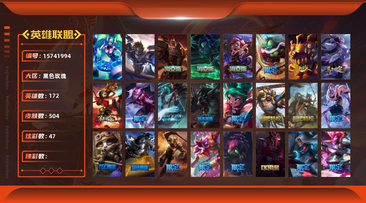 - [17038271]未定级段位-170英雄-286皮肤-71炫彩-0终极-11神话-31限定-23传说-72史诗 【神话皮肤】:十周年纪念安妮,源代码乐芙兰,十五周年纪念希维尔,神凰行者瑞羽圣凰艾尼维亚,水晶圣骑塔莉娅,海克斯科技嘉文四世,摄魂使者薇恩,新创战纪希维尔,至臻征服者贾克斯,至臻KDA卡莎,至臻灵魂莲华提莫 【至臻皮肤】:至臻灵魂莲华提莫,至臻征服者贾克斯,至臻KDA卡莎 【臻彩皮肤】:无畏骑士瑟庄妮赤子初心 【年限皮肤】:天龙之子斯莫德 【海克斯皮肤】:新创战纪希维尔,海克斯科技嘉文四世,摄魂使者薇恩 【情人节限定】:觅心猎手薇恩,觅心女王艾希 【冰雪限定】:圣诞开心鬼提莫,圣诞精灵崔丝塔娜,圣诞狂欢努努和威朗普,胡桃夹子萨科,邪恶圣诞老人维迦,雪装奈德丽,圣诞老人古拉加斯,魄罗骑士瑟庄妮,冰雪节格雷福斯 【限定皮肤】:冠军之血希瓦娜,冠军之矛卡莉丝塔,SKTT1贾克斯,SKTT1薇恩,FPX薇恩,DWG奈德丽,黎明使者薇恩,胜利凤凰艾尼维亚,胜利之王泰达米尔,胜利之运崔斯特,鬼影重重魔腾,泳池派对普朗克,暗影沃里克,野兽猎人泰达米尔,波比的巧克力工坊,勇者奈德丽,都铎王朝图奇,防暴士兵辛吉德,防暴天使凯尔 【传说皮肤】:铁哥们儿奥拉夫,血石领主弗拉基米尔,大天使长米迦勒凯尔,战场女武神凯尔,提莫约德尔人的一大步,合金巨兽努努和威朗普,女皇艾希,双重冰晶艾尼维亚,未来战士凯特琳,战斗学院凯特琳,太空律动猫猫布里和里茨,源计划净化薇恩,光明哨兵薇恩,第三类接触黑默丁格,炼狱魔犬内瑟斯,战斗学院伊泽瑞尔,黎明使者锐雯,黯黑魔龙希瓦娜,焰尾妖狐阿狸,宇航员诺提勒斯,泳池派对吉格斯,西部天使赛娜,真实伤害艾克 【史诗皮肤】:翼骑统领赵信,摄魂男爵弗拉基米尔,天人合一易,侍魂易,铁血剑豪易,地狱火阿利斯塔,战场公主希维尔,兔宝宝提莫,熊猫提莫,火箭达人崔丝塔娜,百夫长贾克斯,黑色荆棘莫甘娜,死神卡尔萨斯,小小骑士阿木木,殇之机器人阿木木,熔火之心拉莫斯,飞越疯人院萨科,战争血统蒙多,海克斯科技迦娜,寒冰女皇迦娜,穿着正装的恶魔维迦,抵抗军天使凯特琳,古墓丽影凯特琳,铁血狙击手凯特琳,霸天巨兽墨菲特,无畏号墨菲特,海贼魅影卡特琳娜,暗夜猫女卡特琳娜,前线指挥官卡特琳娜,蓝焰梦魔魔腾,龙骑统帅嘉文四世,暗星嘉文四世,死亡绽放伊莉丝,三昧真火孙悟空,V字仇杀者布兰德,屠龙勇士薇恩,深海