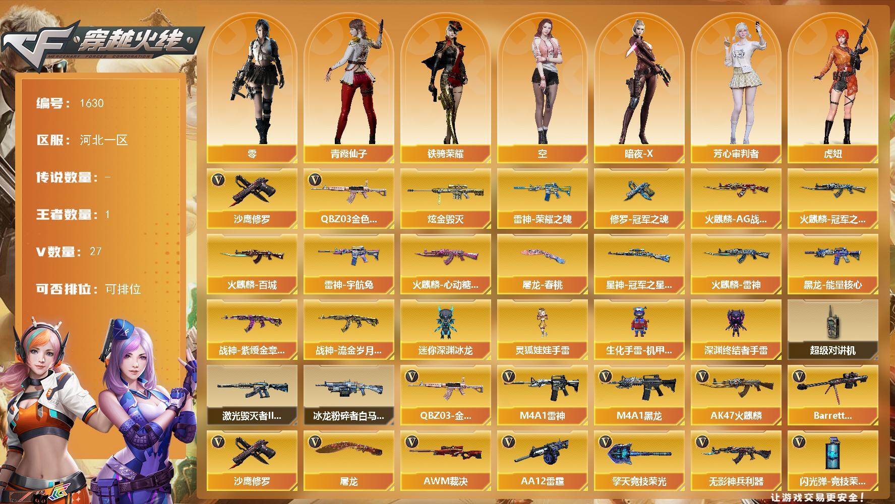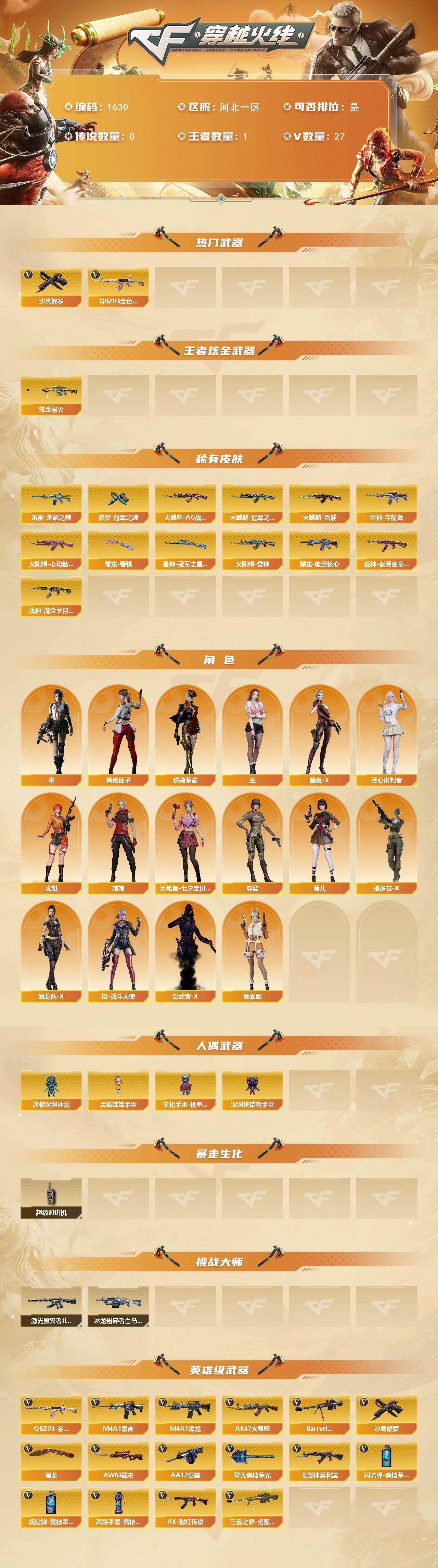 [15742107]河北一区-27V-1王者-2炫金 【热门武器】:QBZ03-金色蔷薇,沙鹰-修罗*4 【王者炫金武器】:炫金毁灭*2 【皮肤】:Kar98K-星神-冠军之星皮肤,雷神-荣耀之魄,雷神-宇航兔皮肤,火麒麟-AG战队皮肤,火麒麟-雷神,火麒麟-冠军之心,火麒麟-百城,火麒麟-心动糖果,黑龙-能量核心*2,战神-紫绶金章皮肤,战神-流金岁月皮肤*2,修罗-冠军之魂*2,屠龙-春桃 皮肤 【角色】:零,空,暗夜-X,芳心审判者,虎妞,娟娟,灵狐者-七夕宝贝,麻雀,萌儿,潘多拉-X,潜龙队-X,青霞仙子,铁骑荣耀,兔囡囡,樱-战斗天使,影武者-X 【人偶武器】:迷你深渊冰龙*2,生化手雷-机甲核心*2,深渊终结者手雷,灵狐娃娃手雷 【暴走生化】:超级对讲机 【挑战大师】:冰龙粉碎者-白马银枪,激光毁灭者III-白马银枪 【英雄级武器】:AK47-火麒麟*2,M4A1-黑龙,M4A1-雷神*2,无影-神兵利器,QBZ03-金色蔷薇,AK-47-猩红传说*3,Barrett-毁灭,AWM-裁决,王者之怒-觉醒版,AA-12-雷霆,沙鹰-修罗*4,屠龙*2,擎天-竞技荣光,高爆手雷-竞技荣光*2,闪光弹-竞技荣光,烟雾弹-竞技荣光 【道具】:云海游龙炫彩背包,冰冰企鹅背包-猛男专用,虎牙炫彩背包,超级背包,夺命之镰,防化服,星辰流光-枪王排位,枪王排位28赛季金色流光,枪王排位29赛季金色流光,防弹头盔*5,防弹衣*4,C4工具钳*3,手雷包*2 【特殊枪械】: