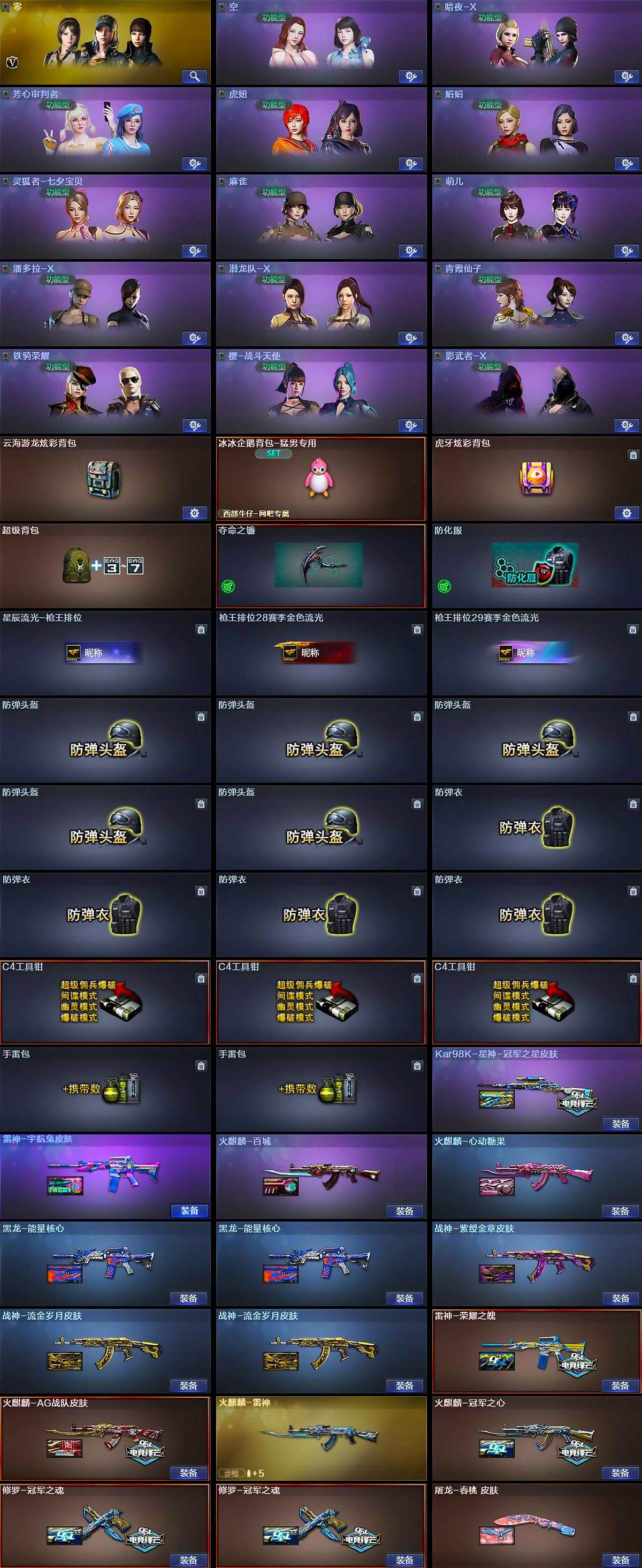 【道具】:云海游龙炫彩背包,冰冰企鹅背包-猛男专用,虎牙炫彩背包,超级背包,夺命之镰,防化服,星辰流光-枪王排位,枪王排位28赛季金色流光,枪王排位29赛季金色流光,防弹头盔*5,防弹衣*4,C4工具钳*3,手雷包*2