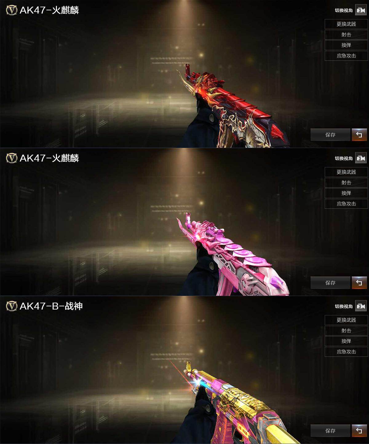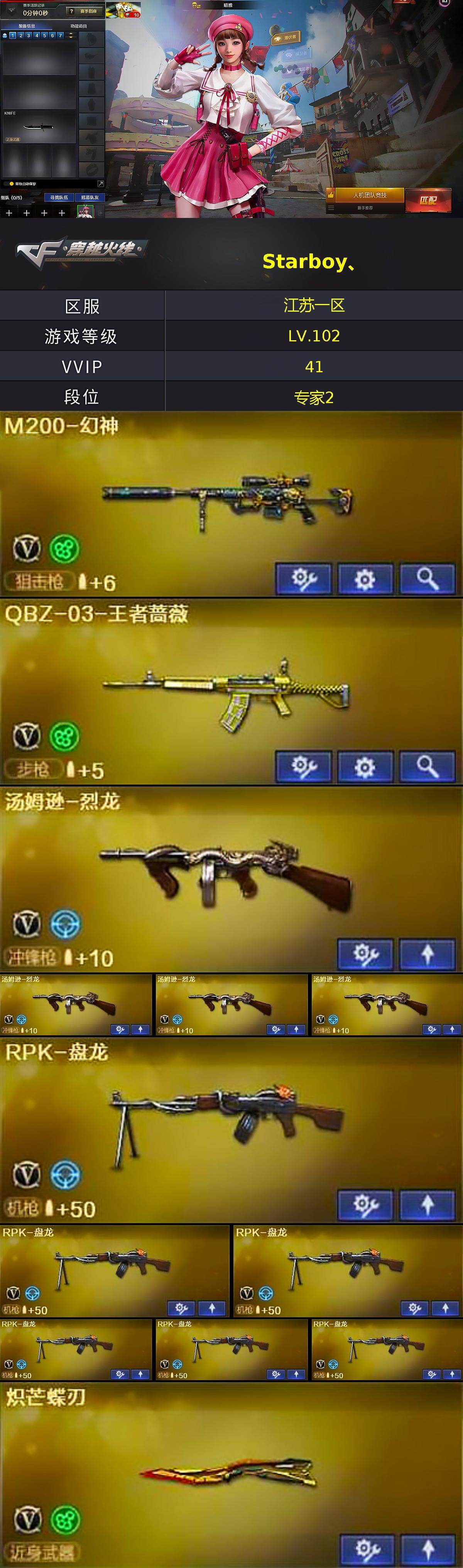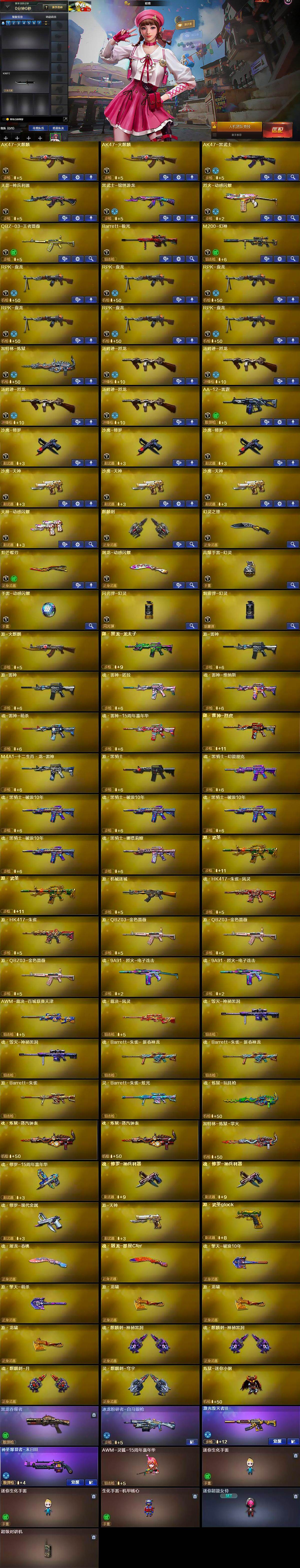 【英雄级武器】:AK47-火麒麟*2,AK47-黑武士,无影-神兵利器,黑武士-锦绣游龙,QBZ03-独角-VI,烈火-动感闪耀,QBZ-03-王者蔷薇-觉醒版,Barrett-极光,M200-幻神,RPK-盘龙*6,加特林-炼狱,汤姆逊-烈龙*4,AA-12-雷霆,沙鹰-修罗*3,沙鹰-天神*3,天神-动感闪耀,麒麟刺,幻灵之锋,炽芒蝶刃,屠龙-动感闪耀,高爆手雷-幻灵,手雷-动感闪耀,闪光弹-幻灵,烟雾弹-幻灵