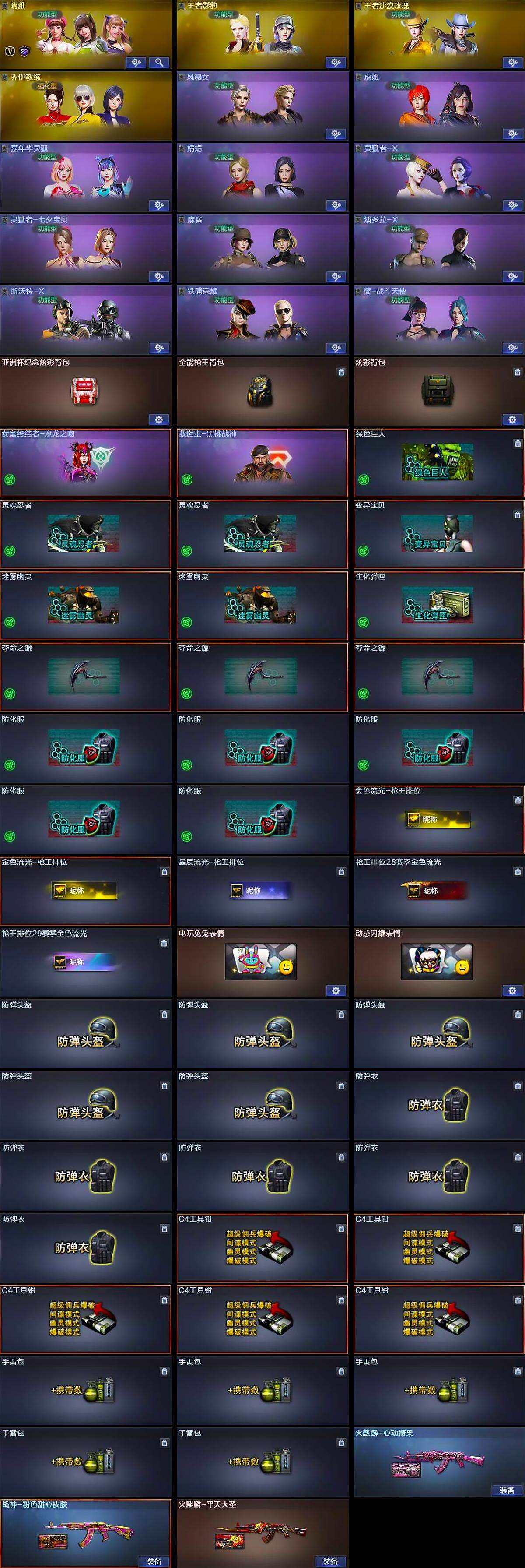 【道具】:亚洲杯纪念炫彩背包,全能枪王背包,炫彩背包,女皇终结者-魔龙之吻,救世主-黑桃战神,绿色巨人,灵魂忍者*2,变异宝贝,迷雾幽灵*2,生化弹匣,夺命之镰*3,防化服*5,金色流光-枪王排位*2,星辰流光-枪王排位,枪王排位28赛季金色流光,枪王排位29赛季金色流光,电玩兔兔表情,动感闪耀表情,防弹头盔*5,防弹衣*5,C4工具钳*5,手雷包*5