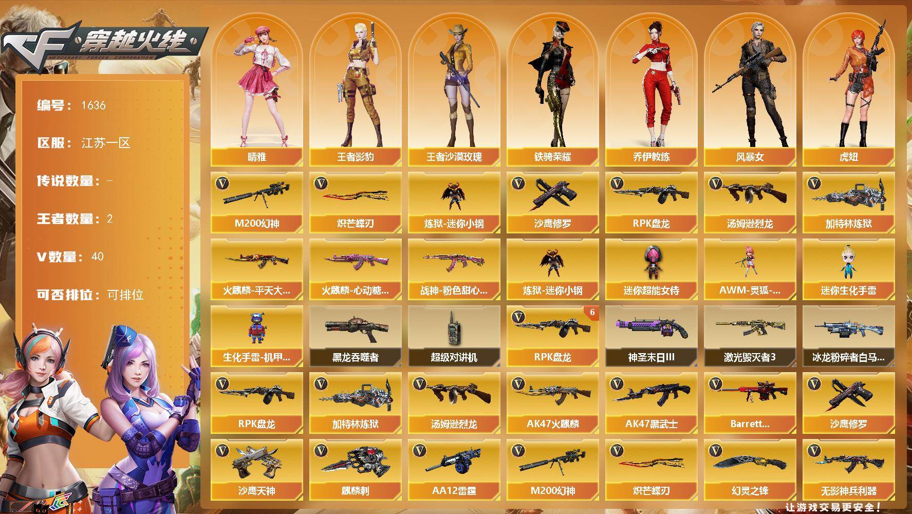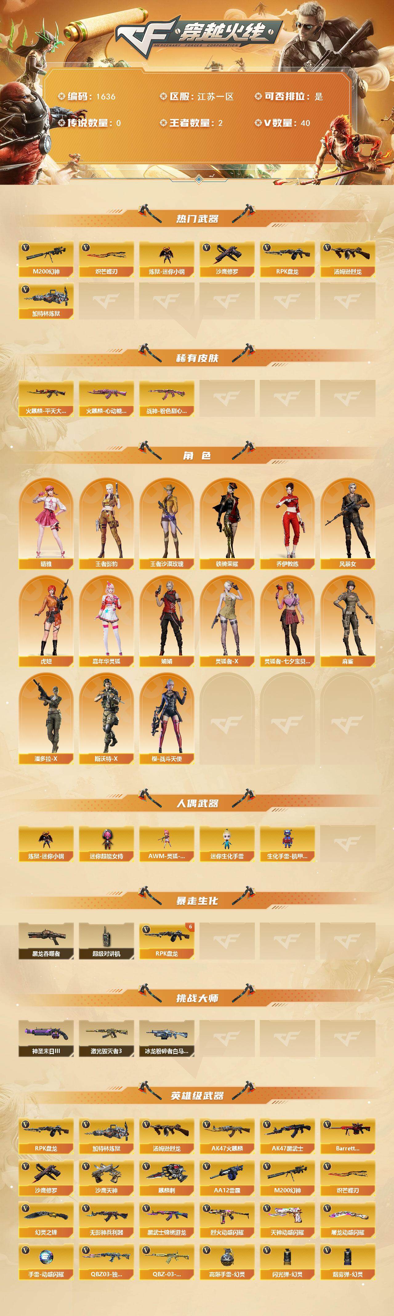 [15742490]江苏一区-40V-2王者-0炫金 【热门武器】:M200-幻神,炼狱-迷你小钢,汤姆逊-烈龙*4,RPK-盘龙*6,加特林-炼狱,沙鹰-修罗*3,炽芒蝶刃 【皮肤】:火麒麟-平天大圣,火麒麟-心动糖果,战神-粉色甜心皮肤 【角色】:晴雅,王者影豹,王者沙漠玫瑰,乔伊教练,风暴女,虎妞,嘉年华灵狐,娟娟,灵狐者-X,灵狐者-七夕宝贝,麻雀,潘多拉-X,斯沃特-X,铁骑荣耀,樱-战斗天使 【人偶武器】:炼狱-迷你小钢,AWM-灵狐-15周年嘉年华,迷你生化手雷*2,生化手雷-机甲核心,迷你超能女侍 【暴走生化】:黑龙吞噬者,超级对讲机 【挑战大师】:冰龙粉碎者-白马银枪,激光毁灭者III,神圣爆裂者-末日III 【英雄级武器】:AK47-火麒麟*2,AK47-黑武士,无影-神兵利器,黑武士-锦绣游龙,QBZ03-独角-VI,烈火-动感闪耀,QBZ-03-王者蔷薇-觉醒版,Barrett-极光,M200-幻神,RPK-盘龙*6,加特林-炼狱,汤姆逊-烈龙*4,AA-12-雷霆,沙鹰-修罗*3,沙鹰-天神*3,天神-动感闪耀,麒麟刺,幻灵之锋,炽芒蝶刃,屠龙-动感闪耀,高爆手雷-幻灵,手雷-动感闪耀,闪光弹-幻灵,烟雾弹-幻灵 【道具】:亚洲杯纪念炫彩背包,全能枪王背包,炫彩背包,女皇终结者-魔龙之吻,救世主-黑桃战神,绿色巨人,灵魂忍者*2,变异宝贝,迷雾幽灵*2,生化弹匣,夺命之镰*3,防化服*5,金色流光-枪王排位*2,星辰流光-枪王排位,枪王排位28赛季金色流光,枪王排位29赛季金色流光,电玩兔兔表情,动感闪耀表情,防弹头盔*5,防弹衣*5,C4工具钳*5,手雷包*5 【特殊枪械】:4烈龙,6盘龙,1炼狱