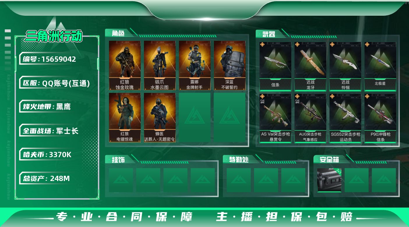 [15659042]【10435774】248m总资产-3370k哈伏币-60烽火等级-黑鹰-34战场等级-军士长 【干员外观】:红狼-蚀金玫瑰,骇爪-水墨云图,蜂医-送葬人·无题密令,深蓝-不破誓约,红狼-电锯惊魂,露娜-金牌射手 【近战皮肤】:近战-怜悯,近战-北极星,近战-信条,近战-龙牙,近战-黑鹰 【典藏外观】:AUG突击步枪-气象感应,M7战斗步枪-棱镜攻势S2*2,AS Val突击步枪-悬赏令 【传说外观】:M4A1突击步枪-蚀金玫瑰,M4A1突击步枪-阿米娅,ASh-12战斗步枪-鹅鸭杀,K416突击步枪-白鹰军团,SG552突击步枪-白鹰军团,SG552突击步枪-运动员,AK-12突击步枪-特斯拉线圈,SCAR-H战斗步枪-水墨云图,SCAR-H战斗步枪-启航,G3战斗步枪-骑士,CAR-15突击步枪-阿米娅,腾龙突击步枪-捞点薯条,K437突击步枪-北极星,KC17突击步枪-电锯惊魂,P90冲锋枪-信条,UZI冲锋枪-特斯拉线圈,SR-3M紧凑突击步枪-特斯拉线圈,勇士冲锋枪-能天使-午夜邮差,QCQ171冲锋枪-北极星,QCQ171冲锋枪-鹅鸭杀,725双管霰弹枪-送葬人-无题密令,M250通用机枪-骑士之心,QJB201轻机枪-鹅鸭杀,SR-25射手步枪-信条,AWM狙击步枪-捞点薯条,G18-创益工坊,93R-捞点薯条,复合弓-黑·天际线 【史诗外观】:M870霰弹枪-飓风行动,KC17突击步枪-碎冰行动,ASh-12战斗步枪-无极限,M16A4突击步枪-竞赛选手,AUG突击步枪-蝮蛇,M7战斗步枪-百步穿杨,SG552突击步枪-深海恐惧,SCAR-H战斗步枪-囚徒,G3战斗步枪-流沙送葬,AS Val突击步枪-百步穿杨,腾龙突击步枪-无垢,腾龙突击步枪-猎鳄行动,K437突击步枪-守护者,MP5冲锋枪-深海恐惧,MP5冲锋枪-战术竞备,MP5冲锋枪-竞技风,Vector冲锋枪-百步穿杨,Vector冲锋枪-异域战争,SR-3M紧凑突击步枪-荒野求生,SR-3M紧凑突击步枪-战术竞备,勇士冲锋枪-深海恐惧,勇士冲锋枪-工业狂潮,MP7冲锋枪-无垢,MP7冲锋枪-守护者,PKM通用机枪-蝮蛇,PKM通用机枪-荒野求生,Mini-14射手步枪-守护者,SVD狙击步枪-阿萨拉工艺,SVD狙击步枪-荒野求生,M14射手步枪-甜心子弹,PSG-1射手步枪-无垢,SV-