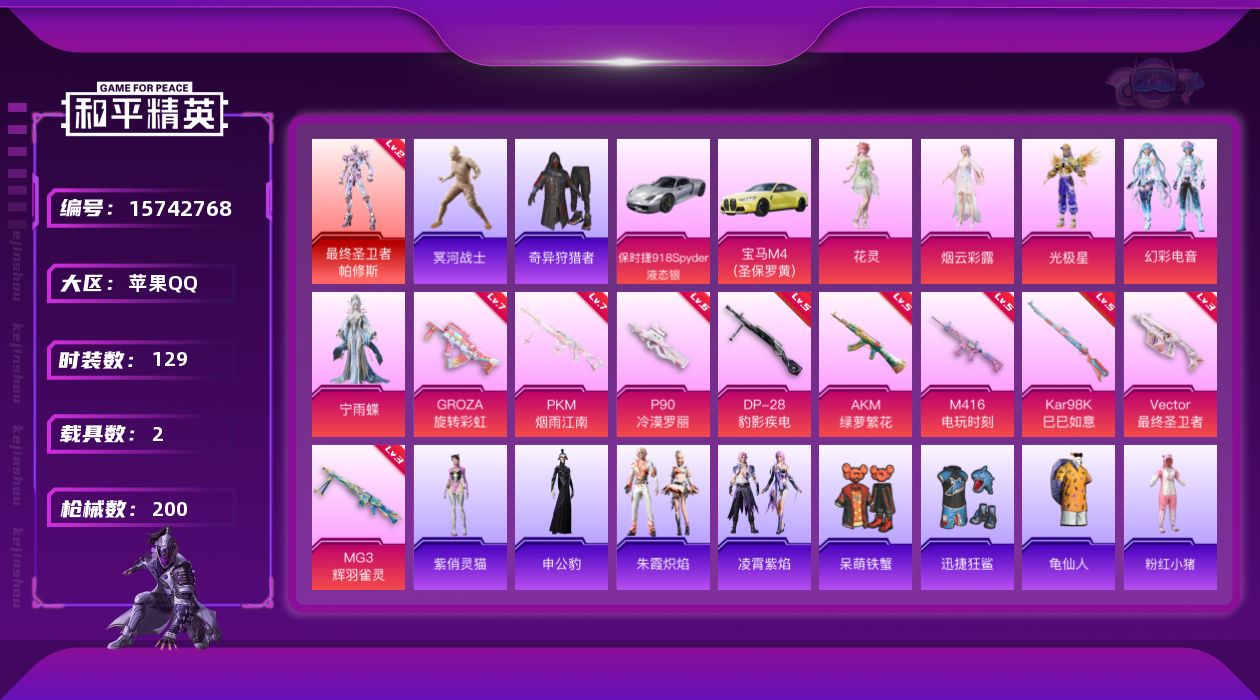 [15742768]老木乃伊/地铁满天赋【店主推荐捡漏号!可直接换绑】苹果 手Q-1神装-5粉装-9特效枪-2载具-5粉色飞行器-62464热力值-13王牌印记-129套装-200枪皮【红色神装等级】:最终圣卫者-帕修斯(二级)【红色角色神装】:最终圣卫者-帕修斯【热门品类】:套装-冥河战士,套装-奇异狩猎者,套装-龟仙人,套装-粉红小猪【粉色载具】:宝马M4(圣保罗黄),保时捷918 Spyder(液态银)【粉色套装】:角色-烟云彩露,角色-光极星,粉装-幻彩电音,角色-宁雨蝶,角色-花灵【粉色枪皮等级】:AKM-绿萝繁花(五级),M416-电玩时刻(五级),GROZA-旋转彩虹(七级),Vector-最终圣卫者(三级),P90-冷漠罗丽(六级),Kar98K-巳巳如意(五级),DP-28-豹影疾电(五级),MG3-辉羽雀灵(三级),PKM-江南烟雨(七级)【粉色枪皮】:AKM-绿萝繁花,M416-电玩时刻,GROZA-旋转彩虹,Vector-最终圣卫者,P90-冷漠罗丽,Kar98K-巳巳如意,DP-28-豹影疾电,MG3-辉羽雀灵,PKM-江南烟雨【粉色飞行器】:魔法神域飞行器,圣域金龙飞行器,雀灵庇佑飞行器,终晖之翼飞行器