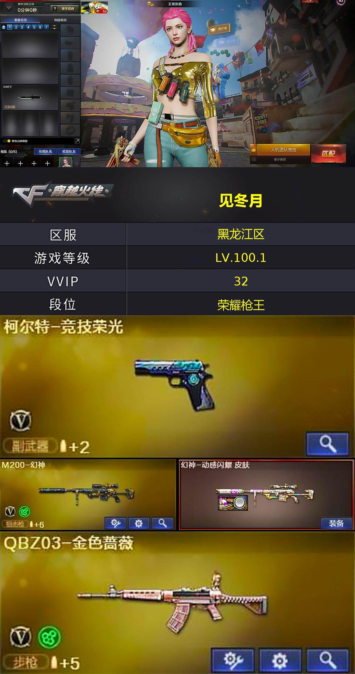 [15743039]黑龙江区-31V-1王者-0炫金 【热门武器】:QBZ03-金色蔷薇,M200-幻神,M4A1-黑骑士,加特林-炼狱 【音效卡】:M4A1-黑骑士音效卡 【皮肤】:幻神-动感闪耀 皮肤,毁灭-神秘黑洞皮肤,毁灭-英雄计划 皮肤,黑龙-能量核心,黑骑士-地狱火 【角色】:王者涂鸦,暗夜-X,初恋灵狐,娟娟,龙儿,曼陀罗-X,潘多拉-甜心教官,潜龙队-X,雪莉杨-摸金校尉,影武者-X 【人偶武器】:闪光弹-小乔 【暴走生化】:超级对讲机 【挑战大师】:冰龙粉碎者-白马银枪,激光毁灭者III 【英雄级武器】:AK47-火麒麟,M4A1-黑龙,M4A1-黑骑士,AK47-黑鲨,QBZ03-金色蔷薇,王者之武-觉醒版,AK47-B-战神,Barrett-毁灭*5,M200-幻神,Barrett-朱雀,加特林-炼狱,柯尔特-竞技荣光,屠龙,擎天-竞技荣光,高爆手雷-竞技荣光*3,闪光弹-竞技荣光*3,烟雾弹-竞技荣光*3 【道具】:CFS限定背包,炫彩背包,超级背包,绿色巨人,灵魂忍者,迷雾幽灵,夺命之镰,防化服*2,金色流光-枪王排位*2,星辰流光-枪王排位,枪王排位28赛季金色流光,防弹头盔*7,防弹衣*6,C4工具钳*4,手雷包*4 【特殊枪械】:1黑骑士,1炼狱