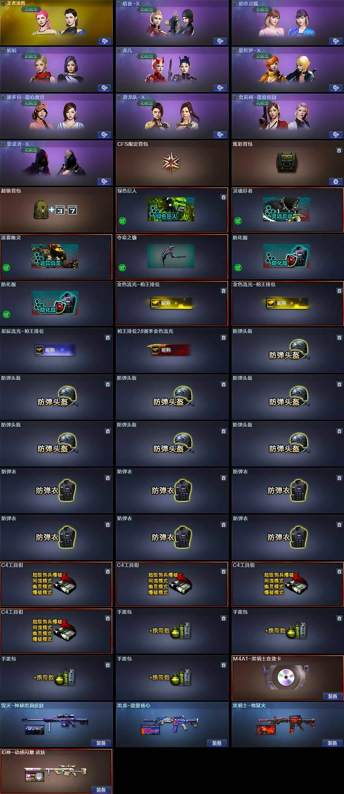 【道具】:CFS限定背包,炫彩背包,超级背包,绿色巨人,灵魂忍者,迷雾幽灵,夺命之镰,防化服*2,金色流光-枪王排位*2,星辰流光-枪王排位,枪王排位28赛季金色流光,防弹头盔*7,防弹衣*6,C4工具钳*4,手雷包*4