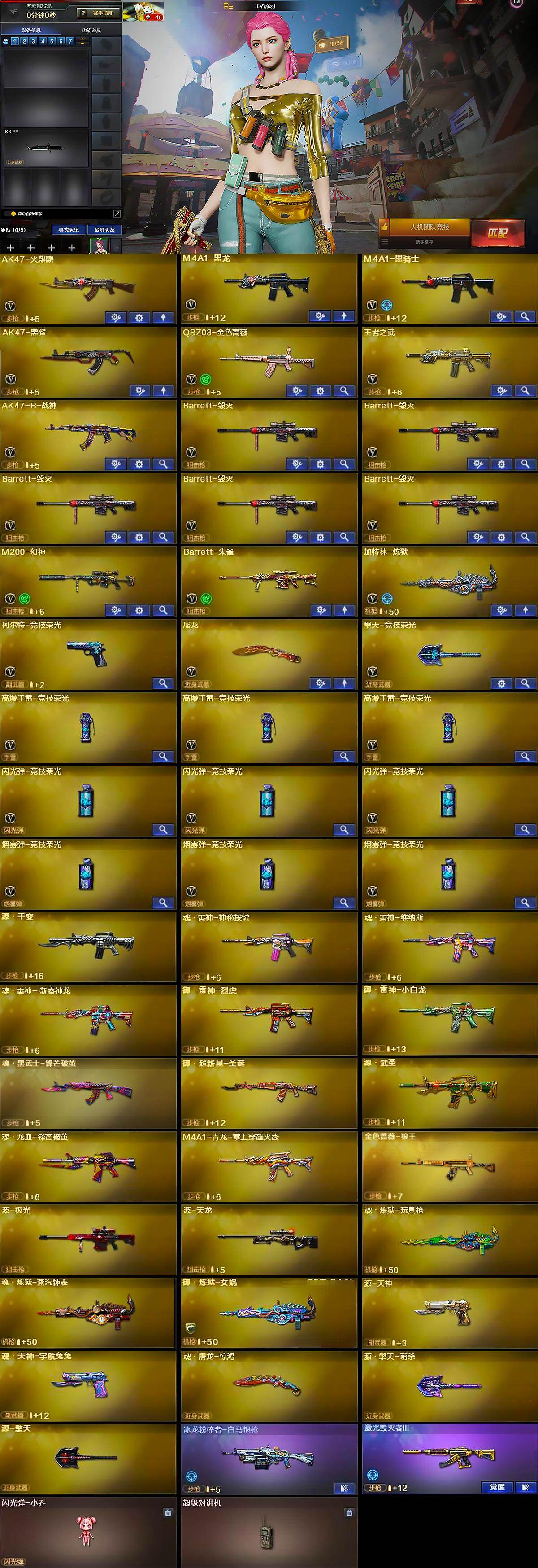 - [16525961]专家S-2英雄角色数-146英雄武器数 【热门武器】:KSG-孟获,81式-光明之神,M4A1-星象,AWM-游骑兵*2,COP 357-雷霆 【角色】:葵,零-新生 【英雄武器】:AK47-火麒麟,AK47-血武士,AK47-华夏传说,AK47-木兰*2,AK47-谜城烟火,M4A1-雷神,M4A1-黑骑士,M4A1-死神*2,M4A1-星象,M4A1-龙血,M4A1-机械迷城,M4A1-赛博雷神,M4A1-海骑士,M4A1-运输船,M4A1-太白诗仙,SCAR-探星者,SCAR-心动PICK,AN94-赳赳秦师,FAMAS-湮灭,9A91-天神,9A91-魔蜥觉醒,M14EBR-天神,M14EBR-拂影,M16-恶魔,QBZ03-金色蔷薇,QBZ03-玉面羞花,81式-光明之神,G36-机械纪元,QBZ191-封神榜,AWM-游骑兵*2,AWM-裁决,AWM-指南针觉醒,AWM-指南针,AWM-大湾溢彩,巴雷特-毁灭*2,巴雷特-极光*2,09式狙-天神,QBB95-极光,汤姆逊-烈龙,CZS2-心动次元,PP19野牛-造纸术,地狱火,KSG-孟获,USP-机械迷城,沙鹰-修罗*2,沙鹰-火麒麟,沙鹰-天神,气手枪-血月,沙鹰-宇航兔兔,改装GLOCK-木兰*2,双持GLOCK18-本初,GLOCK18-猎神,COP 357-雷霆,QSZ92-华夏传说,女皇利刃-铁胆虎魄,炽芒蝶刃,匕首-浩瀚征途,血阳,手斧-机械迷城,秋逸,屠龙,尼泊尔-竞界荣光,麒麟刺*3,马来剑-毁灭,唐刀-华夏传说*2,唐刀-大唐荣耀*2,擎天,斩魔刀,破邪蛇棍觉醒,马来剑-耀金伯爵,火麒麟手雷,手雷-竞界荣光*3,雷神手雷,高爆手雷-无限,闪光弹-游骑兵*2,黑骑士闪光弹,火麒麟闪光弹,雷神闪光弹,烟雾弹-游骑兵*2,火麒麟烟雾弹,雷神烟雾弹,烟雾弹-星际宇航,燃烧弹-游骑兵