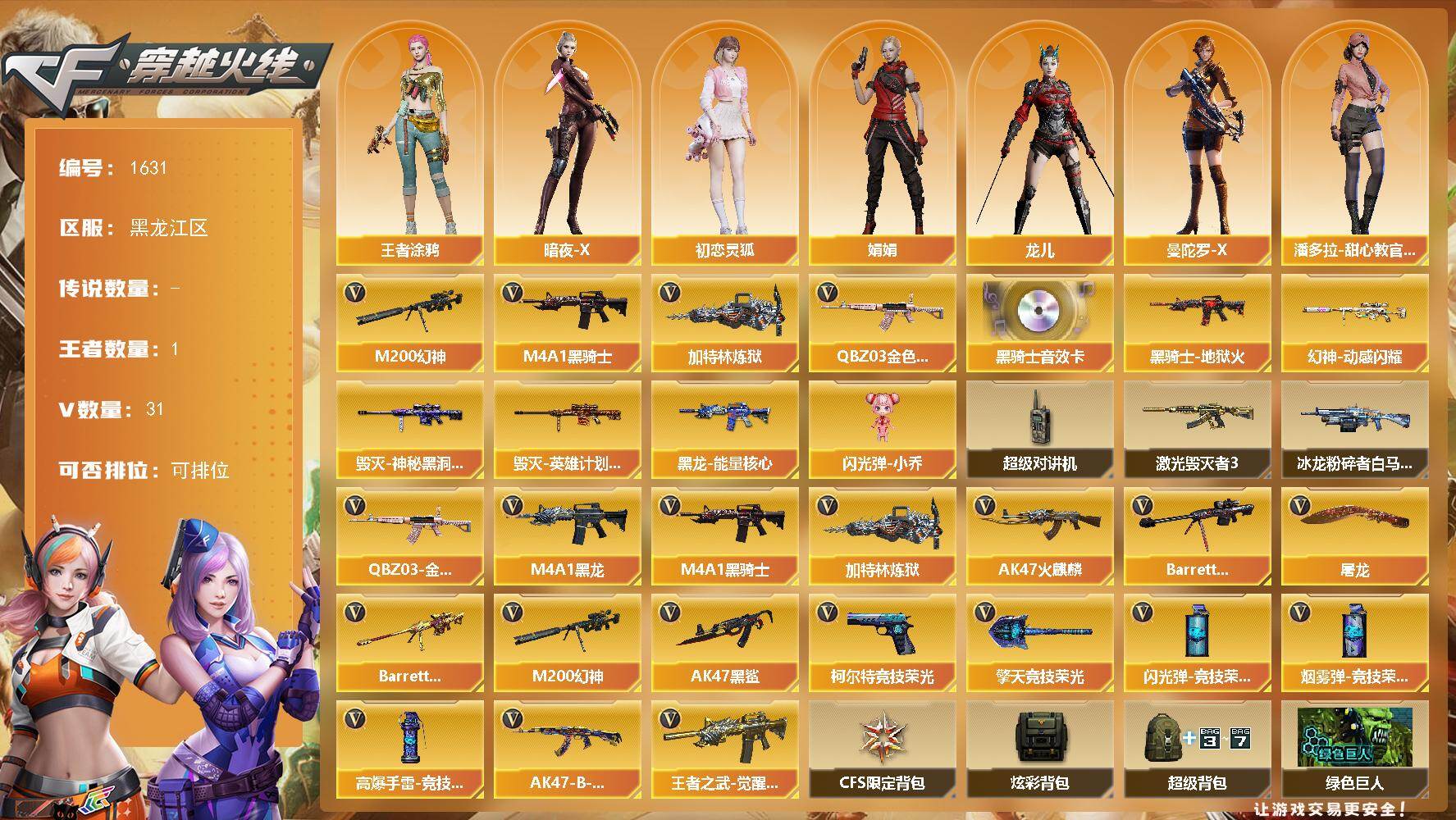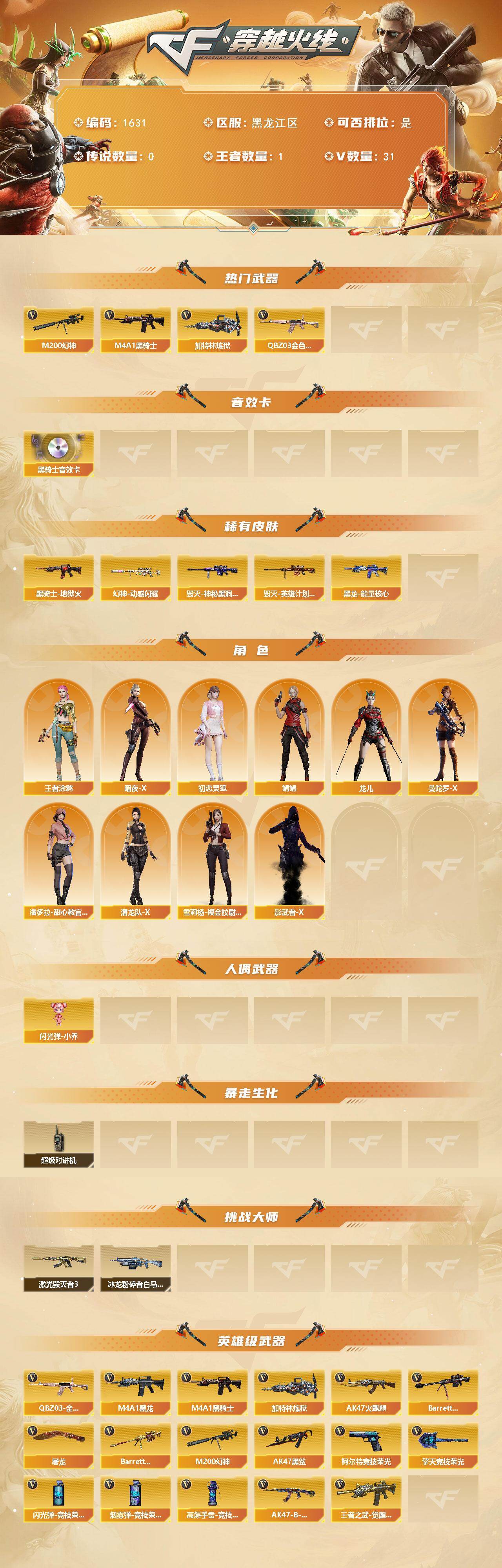 - [15016112]河南一区-35V-1王者-0炫金 【热门武器】:M200-竞技荣光,白虎-电玩蓝兔,Kar98K-星神,M4A1-黑骑士,汤姆逊-烈龙*2,USP-雷暴,沙鹰-修罗*4 【音效卡】:M4A1-黑骑士音效卡,Kar98K-星神音效卡 【皮肤】:雷神-荣耀之魄,雷神-宇航兔皮肤,火麒麟-轻羽皮肤,火麒麟-平天大圣,黑骑士-暗月,炼狱-星空 【角色】:雨棠,电竞教官-云悠悠,蛇隐宗,北极狐-X,初恋灵狐,芳心审判者,虎妞,零-水下丽影,麻雀,曼陀罗-X,潘多拉-X,蛇姬,蜀雪,铁骑荣耀,兔囡囡,职业选手 【人偶武器】:天龙-曼陀罗,火麒麟-灵狐,Scar Light-马枪,迷你超能女侍 【暴走生化】:超级对讲机 【挑战大师】:激光毁灭者III 【英雄级武器】:AK47-火麒麟*3,M4A1-雷神*2,M4A1-黑骑士,AK-47-猩红传说*2,AK47-B-常胜将军,王者白虎-觉醒版,白虎-电玩蓝兔,Kar98K-星神,M200-竞技荣光,汤姆逊-烈龙*2,沙鹰-修罗*4,USP-雷暴,柯尔特-竞技荣光*2,擎天-竞技荣光,高爆手雷-竞技荣光*3,高爆手雷-古蛇迷踪,闪光弹-竞技荣光*3,烟雾弹-竞技荣光*3,烟雾弹-古蛇迷踪 【道具】:云山科技背包,炫彩背包,虎牙炫彩背包,绿色巨人,灵魂忍者,迷雾幽灵,夺命之镰,防化服*3,枪王排位29赛季金色流光,蛇隐宗表情,电玩兔兔表情,循环实验表情,EP战队名片,防弹头盔*7,防弹衣*7,C4工具钳*7,手雷包*7 【特殊枪械】:1黑骑士,2烈龙