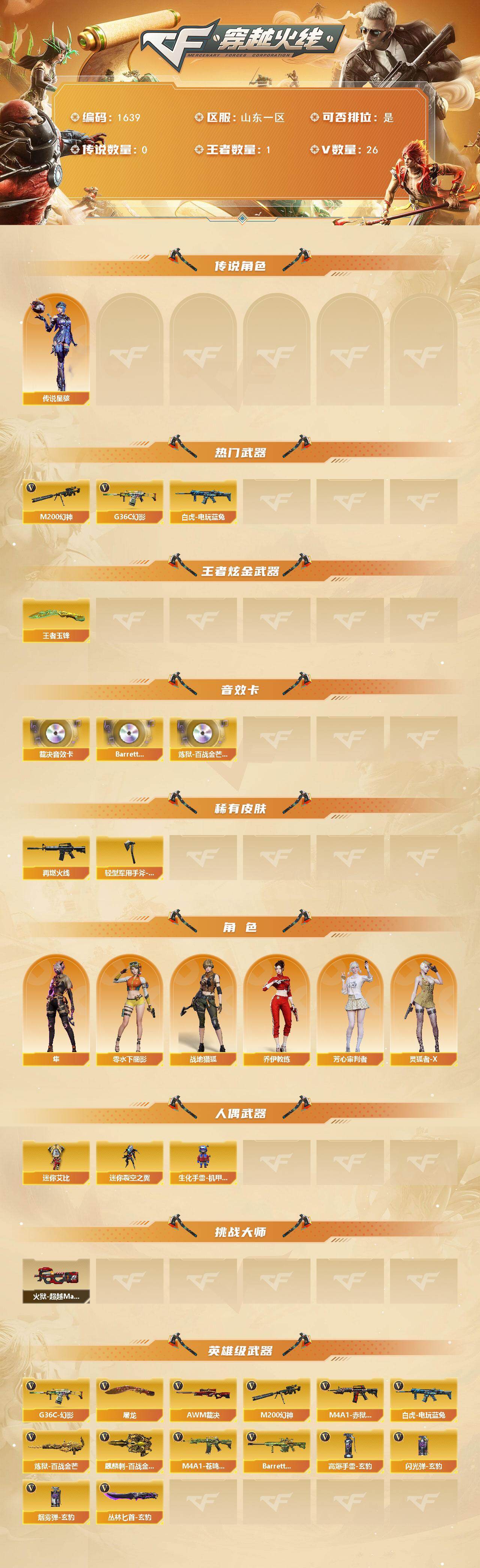 [15743219]山东一区-26V-1王者-0炫金 【传说角色】:传说星骇 【热门武器】:G36C-幻影,M200-幻神,白虎-电玩蓝兔 【王者炫金武器】:王者玉锋 【音效卡】:AWM-裁决音效卡,Barrett-碧霄极光音效卡,炼狱-百战金芒-庆典舞曲音效卡 【皮肤】:M4A1-再燃火线,轻型军用手斧-再燃火线 【角色】:隼,战地猎狐,乔伊教练,芳心审判者,零-水下丽影,灵狐者-X 【人偶武器】:迷你裂空之翼,生化手雷-机甲核心,迷你艾比 【挑战大师】:火狱乱世-超越Max 【英雄级武器】:G36C-幻影,白虎-电玩蓝兔,AWM-裁决,M200-幻神,炼狱-百战金芒,屠龙,麒麟刺-百战金芒,丛林匕首-玄豹,高爆手雷-玄豹,闪光弹-玄豹*2,烟雾弹-玄豹*6,M4A1-赤狱骑士,M4A1-苍鸣雷神,Barrett-碧霄极光 【道具】:云山科技背包,百战金芒炫彩背包,女皇终结者-魔龙之吻,救世主-黑桃战神,绿色巨人,灵魂忍者,迷雾幽灵,夺命之镰,防化服*3,枪王排位29赛季金色流光,语音特效-盛典烟火,萌萌小葵表情,防弹头盔*3,防弹衣*3,C4工具钳*3,手雷包*3 【特殊枪械】: