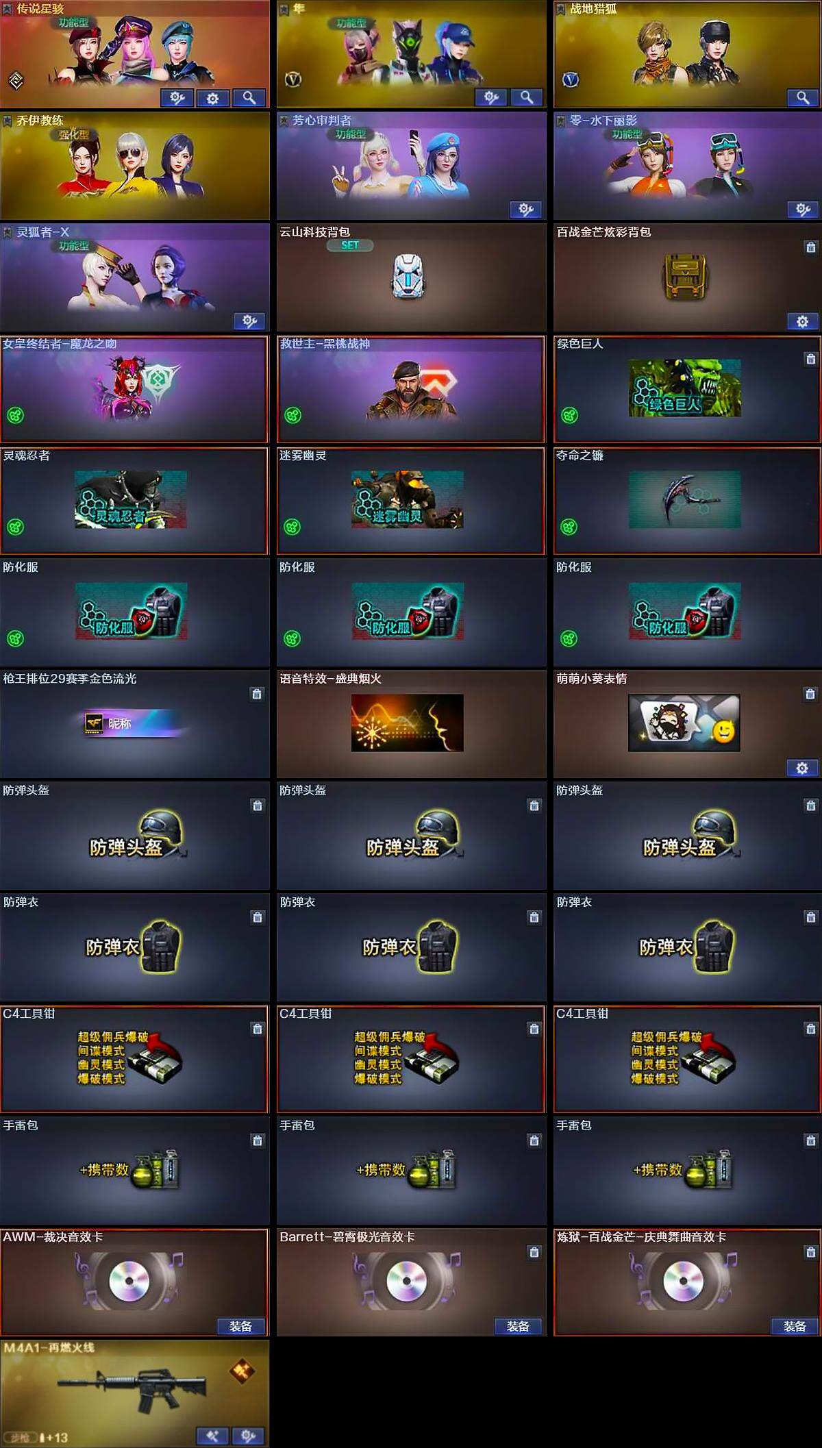 - [16501182]江苏一区-31V-0王者武器数-0炫金武器数 【角色】:炫,芳心审判者,风暴女,兰-海滩派对,零-水下丽影,灵狐-花神,灵狐者-X,玫瑰花神,游珑儿 【挑战大师】:激光毁灭者III-白马银枪 【英雄级武器】:M4A1-雷霆,COP-雷霆,屠龙,高爆手雷-雷霆*7,闪光弹-雷霆*8,烟雾弹-雷霆*7,烟雾弹-云龙,M4A1-赤狱骑士 【道具】:云山科技背包,亚洲杯纪念炫彩背包,冰冰企鹅背包,超级背包,绿色巨人,灵魂忍者,变异宝贝,迷雾幽灵,生化弹匣,夺命之镰,防化服*2,枪王排位28赛季金色流光,防弹头盔*2,防弹衣*2,C4工具钳*2,手雷包*2 【特殊枪械】: