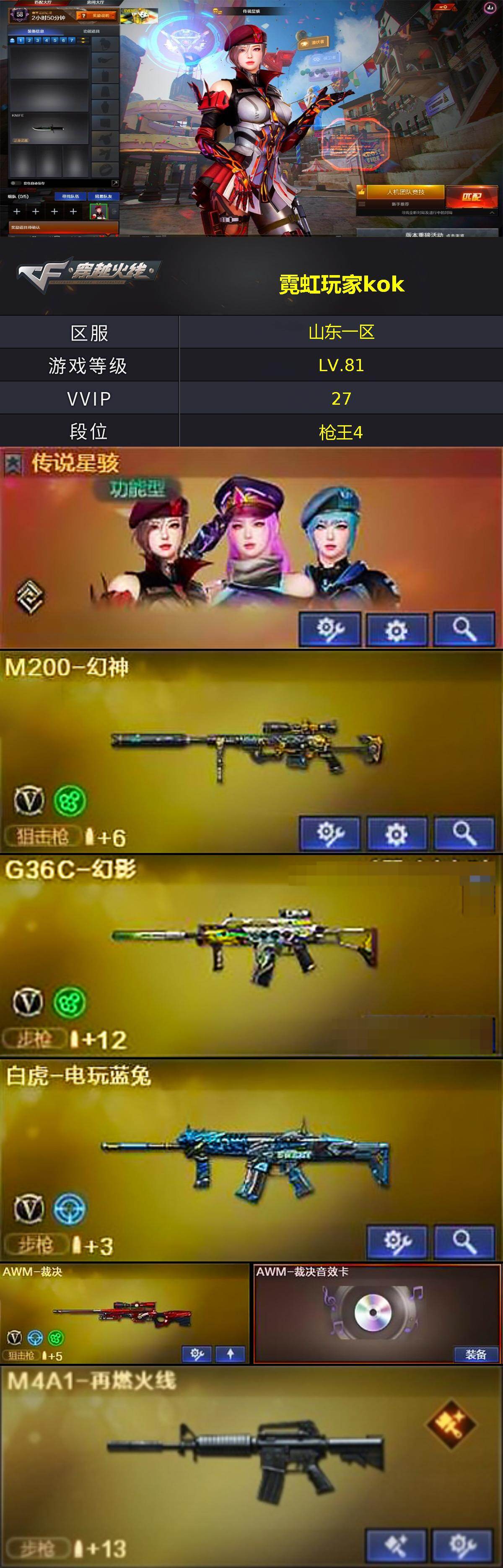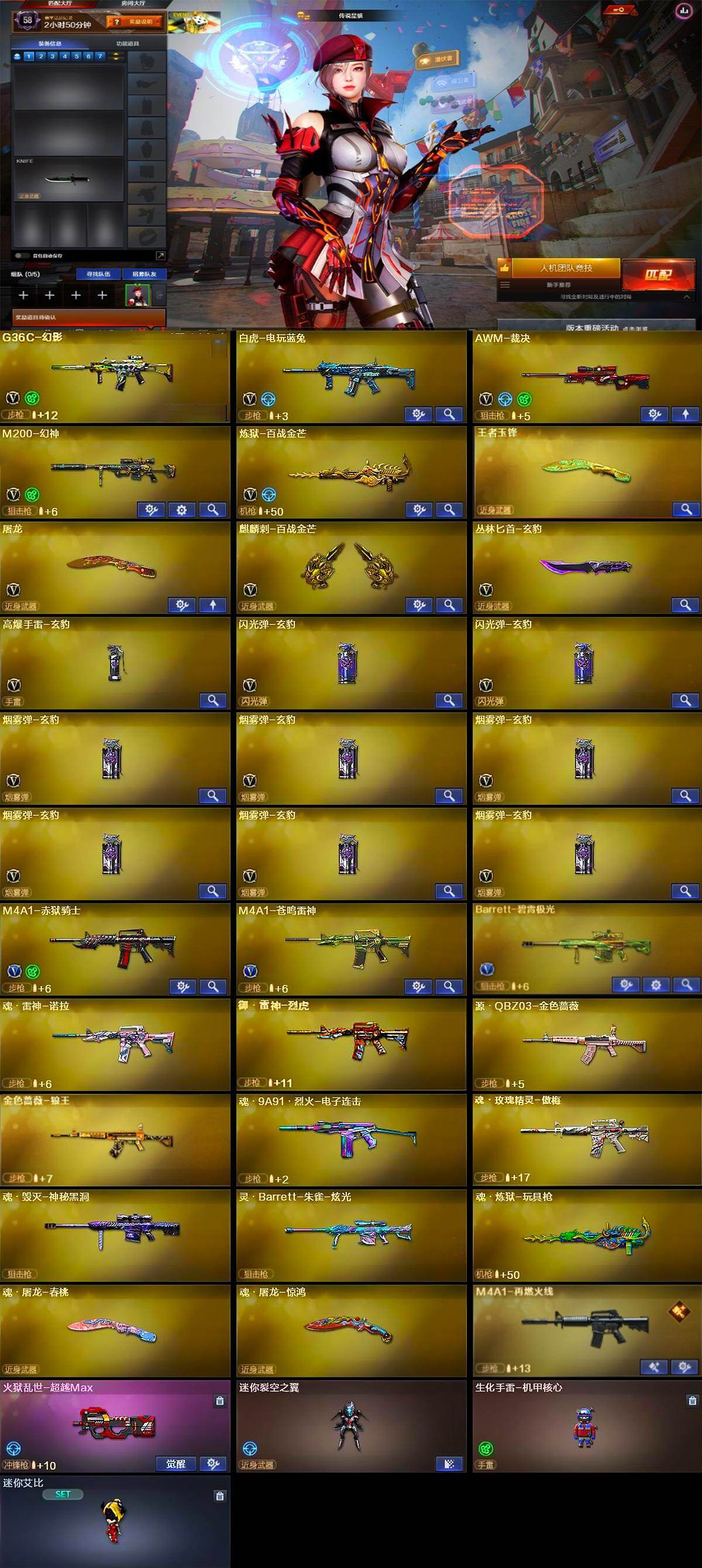 【英雄级武器】:G36C-幻影,白虎-电玩蓝兔,AWM-裁决,M200-幻神,炼狱-百战金芒,屠龙,麒麟刺-百战金芒,丛林匕首-玄豹,高爆手雷-玄豹,闪光弹-玄豹*2,烟雾弹-玄豹*6,M4A1-赤狱骑士,M4A1-苍鸣雷神,Barrett-碧霄极光