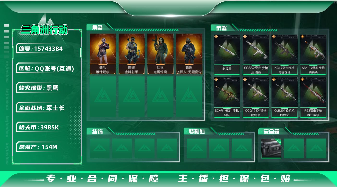 [15743384]【店主推荐捡漏号!可直接换绑】154m总资产-3985k哈伏币-60烽火等级-黑鹰-21战场等级-军士长 【干员外观】:骇爪-维什戴尔,蜂医-送葬人·无题密令,红狼-电锯惊魂,露娜-金牌射手 【近战皮肤】:近战-北极星,近战-黑鹰 【传说外观】:M4A1突击步枪-阿米娅,ASh-12战斗步枪-鹅鸭杀,SG552突击步枪-运动员,AK-12突击步枪-特斯拉线圈,SCAR-H战斗步枪-启航,CAR-15突击步枪-阿米娅,K437突击步枪-北极星,KC17突击步枪-电锯惊魂,Vector冲锋枪-能天使-午夜邮差,UZI冲锋枪-特斯拉线圈,SR-3M紧凑突击步枪-特斯拉线圈,勇士冲锋枪-能天使-午夜邮差,QCQ171冲锋枪-北极星,QCQ171冲锋枪-鹅鸭杀,725双管霰弹枪-送葬人-无题密令,M250通用机枪-骑士之心,QJB201轻机枪-鹅鸭杀,R93狙击步枪-维什戴尔 【史诗外观】:QBZ95-1突击步枪-曙光,ASh-12战斗步枪-无极限,AUG突击步枪-蝮蛇,M7战斗步枪-百步穿杨,SCAR-H战斗步枪-囚徒,G3战斗步枪-流沙送葬,AS Val突击步枪-百步穿杨,腾龙突击步枪-无垢,K437突击步枪-守护者,MP5冲锋枪-战术竞备,MP5冲锋枪-竞技风,Vector冲锋枪-百步穿杨,SR-3M紧凑突击步枪-荒野求生,SR-3M紧凑突击步枪-战术竞备,勇士冲锋枪-工业狂潮,MP7冲锋枪-无垢,MP7冲锋枪-守护者,PKM通用机枪-蝮蛇,PKM通用机枪-荒野求生,M250通用机枪-囚徒,Mini-14射手步枪-守护者,SVD狙击步枪-荒野求生,SR-25射手步枪-聚光灯,PSG-1射手步枪-无垢,SV-98狙击步枪-林中猎手,SV-98狙击步枪-囚徒,M700狙击步枪-蝮蛇,M700狙击步枪-百步穿杨,M700狙击步枪-哈夫克警备,AWM狙击步枪-无极限,AWM狙击步枪-流沙送葬,沙漠之鹰-曙光,复合弓-守护者 【稀有外观】:M7战斗步枪-天际线,PSG-1射手步枪-极地勘察队,M4A1突击步枪-繁盛,AKM突击步枪-战术演练,AKM突击步枪-肃杀,QBZ95-1突击步枪-公平竞技,ASh-12战斗步枪-繁盛,K416突击步枪-虎啸,M7战斗步枪-精英联盟,M7战斗步枪-捣蛋鬼,SCAR-H战斗步枪-荣耀列队,SCAR-H战斗步枪-黄昏,G3战斗步枪-战术演练,