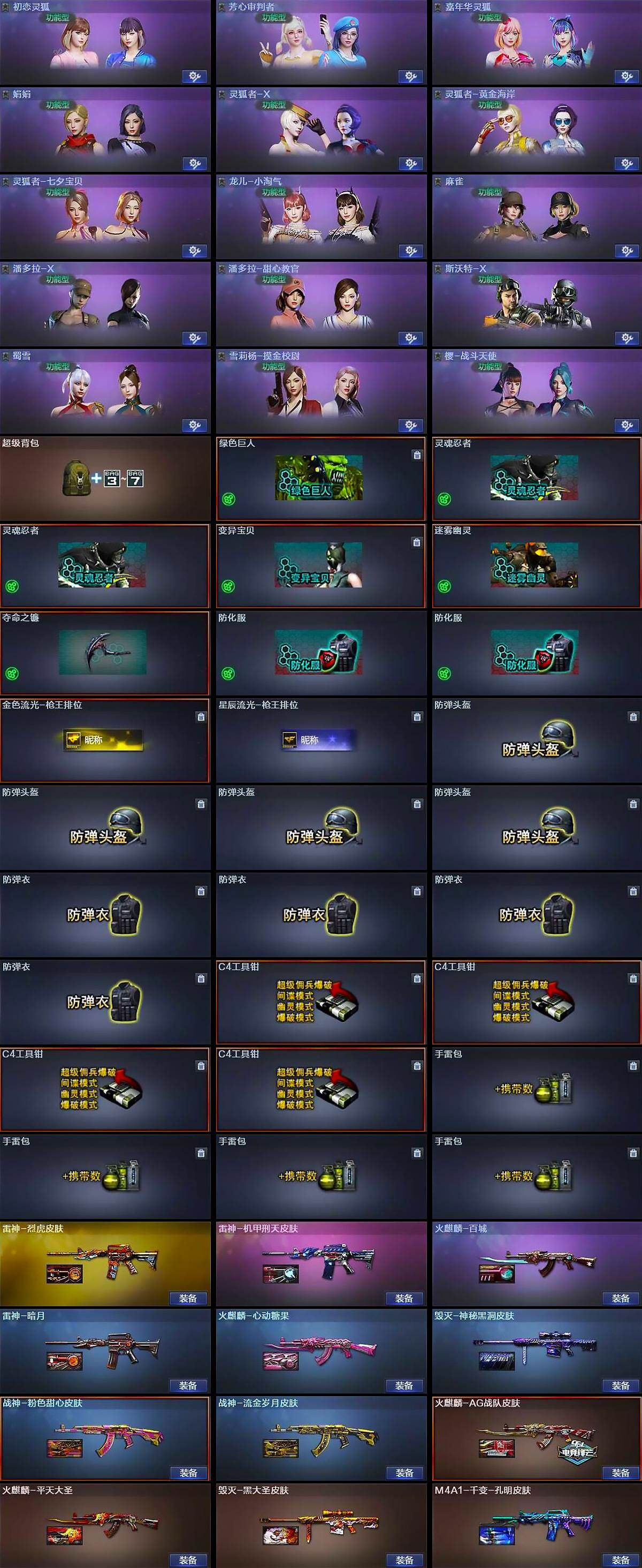 【道具】:超级背包,绿色巨人,灵魂忍者*2,变异宝贝,迷雾幽灵,夺命之镰,防化服*2,金色流光-枪王排位,星辰流光-枪王排位,防弹头盔*4,防弹衣*4,C4工具钳*4,手雷包*4