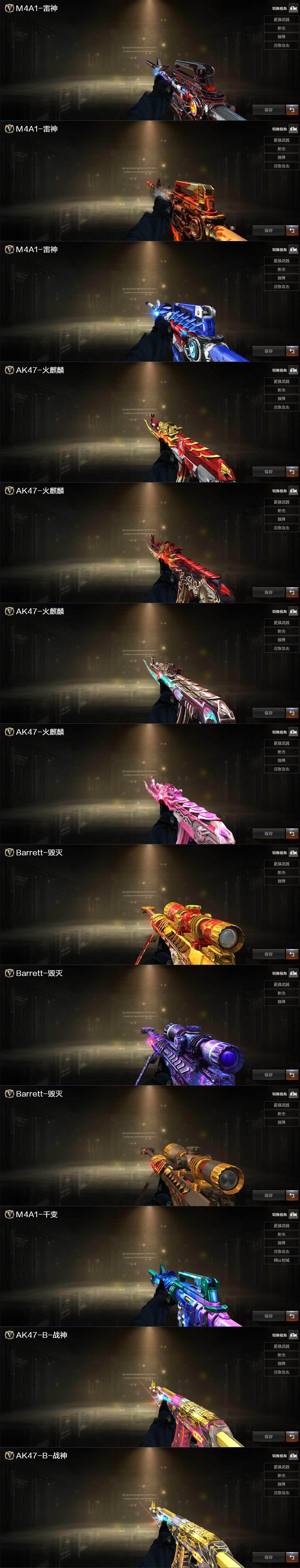 【皮肤】:雷神-暗月,雷神-烈虎皮肤,雷神-机甲刑天皮肤,火麒麟-AG战队皮肤,火麒麟-平天大圣,火麒麟-百城,火麒麟-心动糖果,毁灭-黑大圣皮肤,毁灭-神秘黑洞皮肤,毁灭-英雄计划 皮肤,M4A1-千变-孔明皮肤,战神-粉色甜心皮肤,战神-流金岁月皮肤,AK47-B-常胜将军-曹操