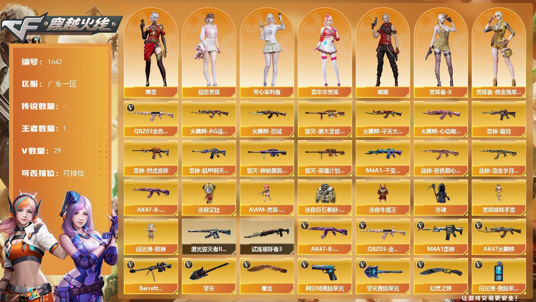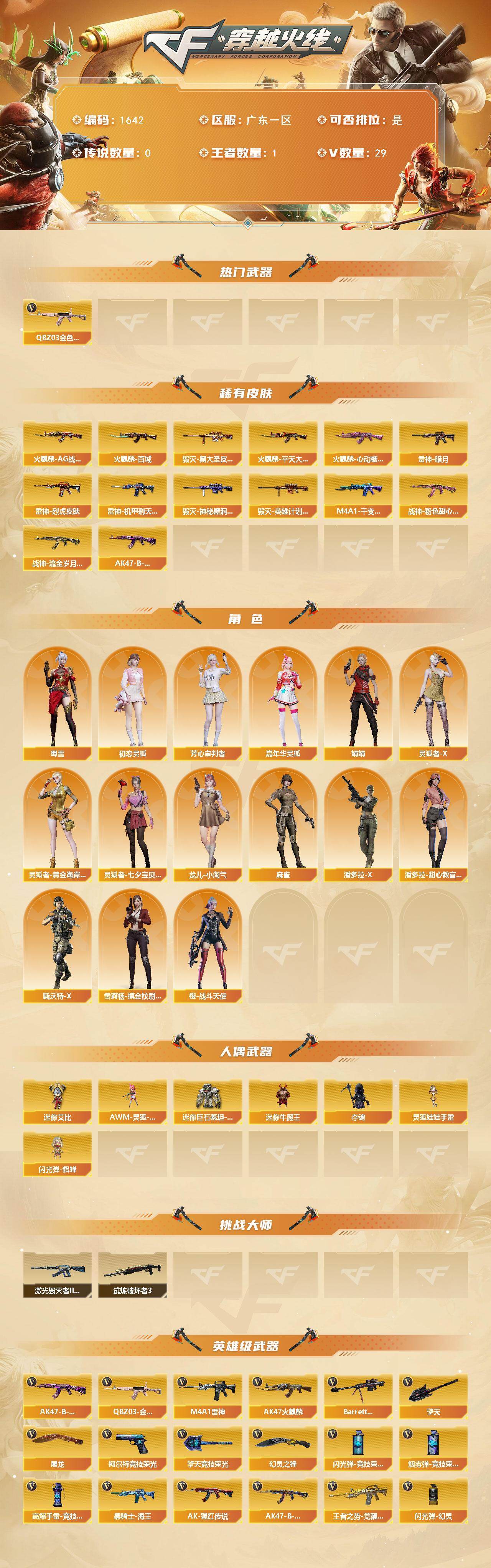 [15744431]广东一区-29V-1王者-0炫金 【热门武器】:QBZ03-金色蔷薇 【皮肤】:雷神-暗月,雷神-烈虎皮肤,雷神-机甲刑天皮肤,火麒麟-AG战队皮肤,火麒麟-平天大圣,火麒麟-百城,火麒麟-心动糖果,毁灭-黑大圣皮肤,毁灭-神秘黑洞皮肤,毁灭-英雄计划 皮肤,M4A1-千变-孔明皮肤,战神-粉色甜心皮肤,战神-流金岁月皮肤,AK47-B-常胜将军-曹操 【角色】:初恋灵狐,芳心审判者,嘉年华灵狐,娟娟,灵狐者-X,灵狐者-黄金海岸,灵狐者-七夕宝贝,龙儿-小淘气,麻雀,潘多拉-X,潘多拉-甜心教官,斯沃特-X,蜀雪,雪莉杨-摸金校尉,樱-战斗天使 【人偶武器】:AWM-灵狐-15周年嘉年华,迷你牛魔王,夺魂,闪光弹-貂蝉,迷你艾比,迷你巨石泰坦-魔花研究所,灵狐娃娃手雷*2 【挑战大师】:激光毁灭者III-白马银枪,试炼破坏者III 【英雄级武器】:AK47-火麒麟*2,M4A1-雷神,QBZ03-金色蔷薇,王者之势-觉醒版,AK-47-猩红传说,AK47-B-战神,黑骑士-海王*2,AK47-B-常胜将军,Barrett-毁灭,柯尔特-竞技荣光,屠龙,擎天,幻灵之锋,擎天-竞技荣光,高爆手雷-竞技荣光*3,闪光弹-幻灵,闪光弹-竞技荣光*2,烟雾弹-竞技荣光 【道具】:超级背包,绿色巨人,灵魂忍者*2,变异宝贝,迷雾幽灵,夺命之镰,防化服*2,金色流光-枪王排位,星辰流光-枪王排位,防弹头盔*4,防弹衣*4,C4工具钳*4,手雷包*4 【特殊枪械】: