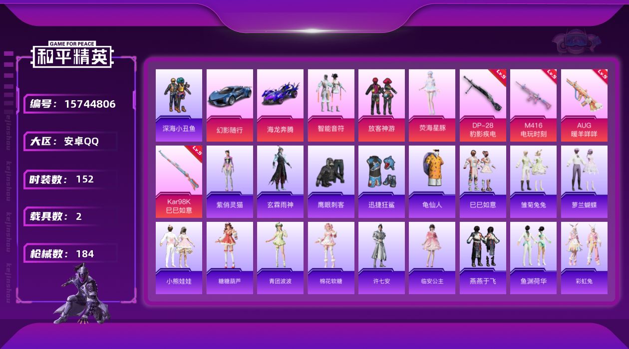 - [12040281]【暑期末清货/特价急出/永久包赔】:苹果 手Q-1粉装-2特效枪-1载具-1.6w热力值-2印记-36套装-61枪皮【稀有载具】:星河领航(磐石银)【特效枪等级】:Kar98K-巳巳如意(五级),DP-28-豹影疾电(五级)【优质套装】:角色-2号机款机体服
