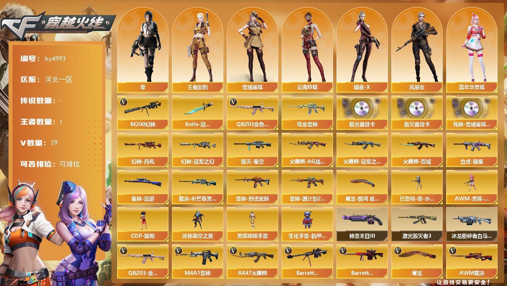 [15746135]河北一区-29V-1王者-1炫金 【热门武器】:QBZ03-金色蔷薇,M200-幻神,Knife-冠军之刃 【王者炫金武器】:炫金雷神 【音效卡】:Barrett-毁灭音效卡,Barrett-极光音效卡,死神-雪域霜狐-怀旧音效卡 【皮肤】:幻神-冠军之幻,幻神-丹凤,Scar Light-白虎-暗星,裁决-叶芒苍灵 皮肤,星神-漫游,雷神-烈虎皮肤,雷神-源计划2.0专属 皮肤,火麒麟-AG战队皮肤,火麒麟-冠军之心,火麒麟-百城,毁灭-星空,屠龙-惊鸿 皮肤 【角色】:零,王者影豹,雪域霜狐,云海玲珑,暗夜-X,风暴女,嘉年华灵狐,灵狐者-七夕宝贝,龙儿-小淘气,女战神,潘多拉-X,莎莎,斯沃特-X 【人偶武器】:巴雷特-零-水下丽影,AWM-灵狐-15周年嘉年华,COP-旗袍,迷你裂空之翼,生化手雷-机甲核心,灵狐娃娃手雷 【挑战大师】:冰龙粉碎者-白马银枪*2,激光毁灭者III,神圣爆裂者-末日III 【英雄级武器】:AK47-火麒麟,M4A1-雷神,M4A1-龙血,无影-神兵利器,QBZ03-金色蔷薇,AK47-B-战神,黑武士-CF网剧冠军,Barrett-毁灭,Barrett-极光,AWM-裁决,M200-幻神,天神-CF网剧冠军,屠龙*4,擎天-CF网剧冠军,王者之锋-觉醒版,高爆手雷-幻灵*2,高爆手雷-竞技荣光,手雷-云海游龙,闪光弹-幻灵,闪光弹-竞技荣光,烟雾弹-幻灵,烟雾弹-竞技荣光*2,M4A1-赤狱骑士 【道具】:云山科技背包,雪域霜狐炫彩背包,救世主-黑桃战神,绿色巨人,灵魂忍者,迷雾幽灵,夺命之镰,防化服*3,金色流光-枪王排位*2,星辰流光-枪王排位,流光-再燃火线,枪王排位29赛季金色流光,语音特效-怀旧,雪域霜狐表情,EP战队击杀图标,防弹头盔*3,防弹衣*3,C4工具钳*3,手雷包*4 【特殊枪械】: