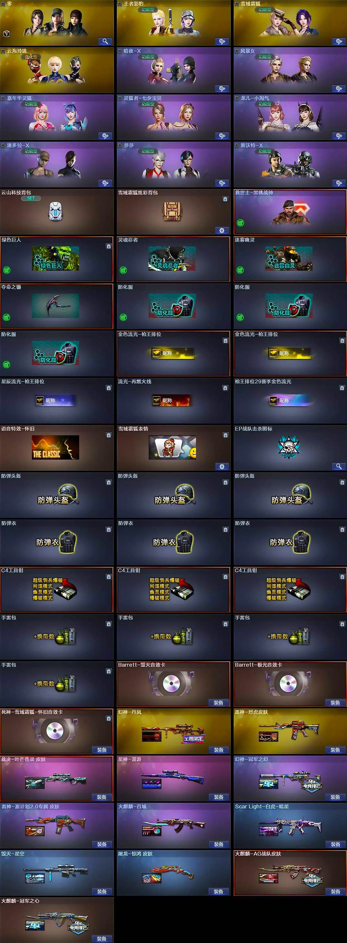 【道具】:云山科技背包,雪域霜狐炫彩背包,救世主-黑桃战神,绿色巨人,灵魂忍者,迷雾幽灵,夺命之镰,防化服*3,金色流光-枪王排位*2,星辰流光-枪王排位,流光-再燃火线,枪王排位29赛季金色流光,语音特效-怀旧,雪域霜狐表情,EP战队击杀图标,防弹头盔*3,防弹衣*3,C4工具钳*3,手雷包*4