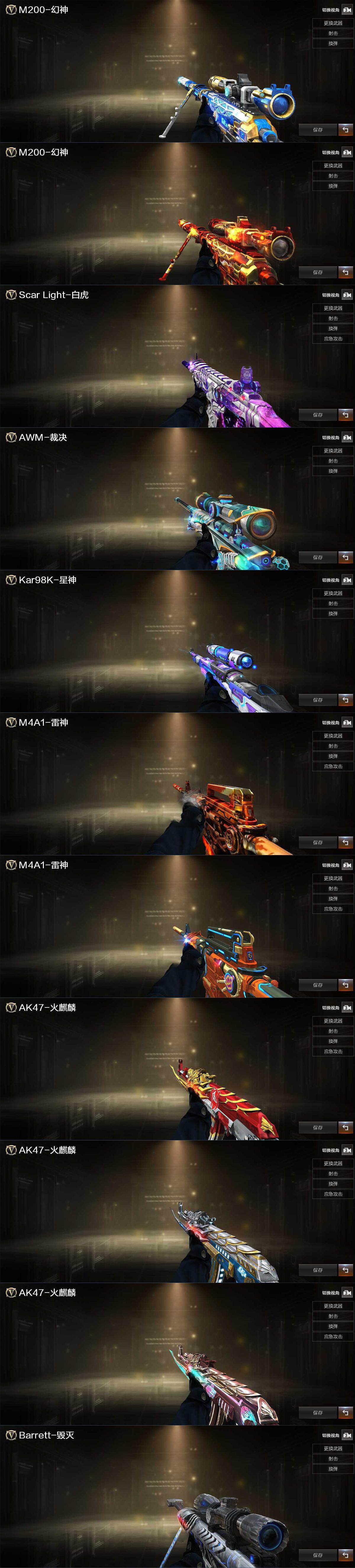【英雄级武器】:AK47-火麒麟,M4A1-雷神,M4A1-龙血,无影-神兵利器,QBZ03-金色蔷薇,AK47-B-战神,黑武士-CF网剧冠军,Barrett-毁灭,Barrett-极光,AWM-裁决,M200-幻神,天神-CF网剧冠军,屠龙*4,擎天-CF网剧冠军,王者之锋-觉醒版,高爆手雷-幻灵*2,高爆手雷-竞技荣光,手雷-云海游龙,闪光弹-幻灵,闪光弹-竞技荣光,烟雾弹-幻灵,烟雾弹-竞技荣光*2,M4A1-赤狱骑士