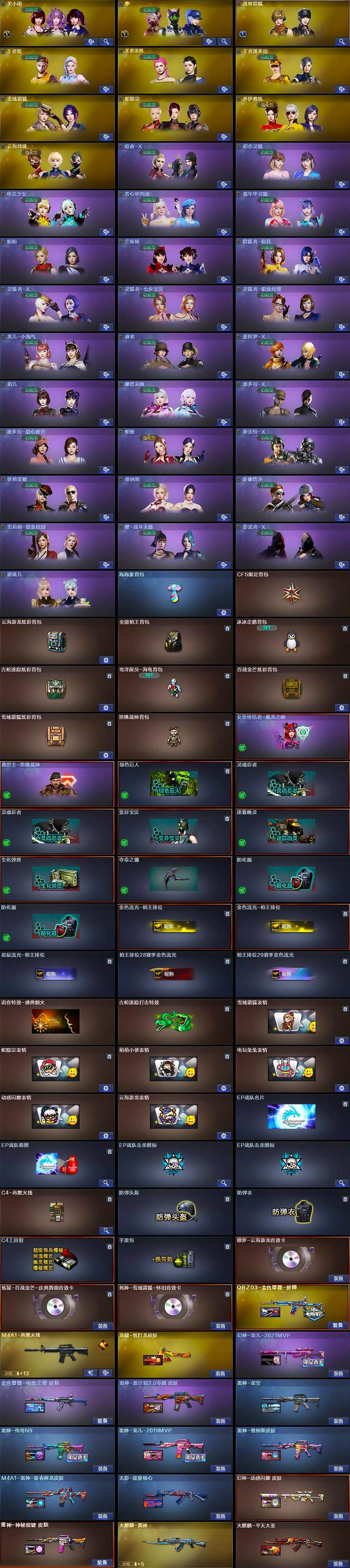 - [9890871]实名: 可修改 时装数: 941 载具数: 3 枪械数: 315 战备数: 238 热门装扮: 奇异狩猎者,梦幻火箭(新101),极限特训,幻影战神,甜心巧克力,未来战士,呆萌铁蟹,怪诞乔克,宝贝奶油派,浪漫波比,天使彩虹糖,梦魇先生,放客神游,迅捷狂鲨,鹰眼刺客,萌熊伴侣,好奇恐龙,都市猎人,彗云及圣,绚金战神,花间之火,新星烈龙,星之彼岸,2号机款机体服,灵感创作师,女娲后裔-赵灵儿,激萌罗小黑,兔兔白日梦,星兔领航员,赤蝎幽灵,派对舞王,飒粉甜心,小可学妹,水仙星,宙之时溯,小蓝,光极星,守护天翼,千金淑猫 载具: 玛莎拉蒂Ghibli(蓝),合金龙骨(蓝),玛莎拉蒂MC20(星石白) 稀有枪皮: UMP45雪国精灵,M762甜蜜誓约,M416五爪金龙,SCAR-L梦幻火箭,AKM甜心宝贝,AWM花间之火,AKM梦之光华,M416风花雪月,GROZA焦糖拿铁,SCAR-L青春物语,M416暖熊萌萌,M16A4垂柳戏鸭,AUG超新星,P90沙丘之主,PKM江南烟雨,M416电玩时刻,破片手榴弹粉粉猫爪,烟雾弹猫咪绅士,AKM-幽焰骑士,AUG-许七安,Kar98K-巳巳如意