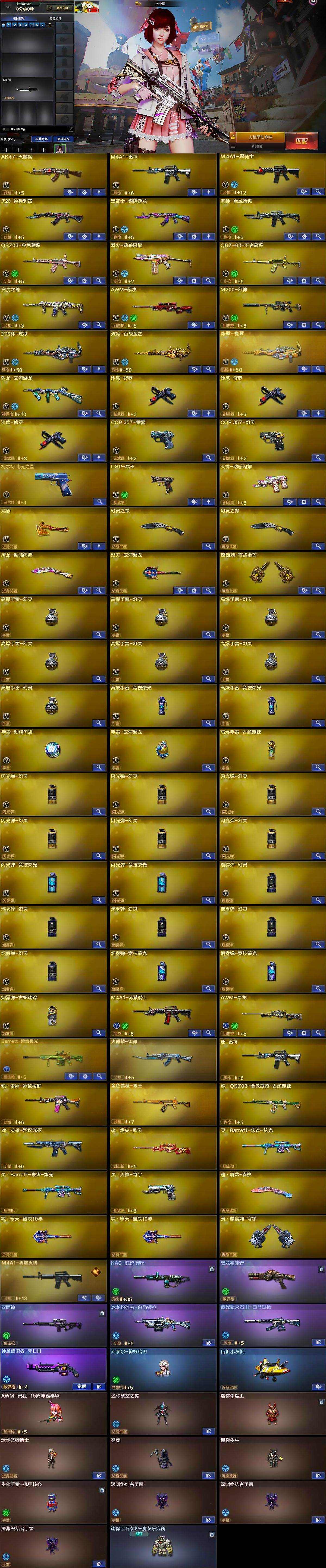 【英雄级武器】:AK47-火麒麟,M4A1-雷神,M4A1-黑骑士,无影-神兵利器,黑武士-锦绣游龙,死神-雪域霜狐,QBZ03-金色蔷薇,烈火-动感闪耀,QBZ-03-王者蔷薇-觉醒版,白虎之魄-觉醒版,AWM-裁决,M200-幻神,加特林-炼狱,炼狱-百战金芒,炼狱-悦蓝-觉醒版,烈龙-云海游龙,沙鹰-修罗*3,COP-雷霆,COP 357-幻灵,柯尔特-电竞之星,USP-冥王,天神-动感闪耀,龙啸,幻灵之锋*2,屠龙-动感闪耀,擎天-云海游龙,麒麟刺-百战金芒,高爆手雷-幻灵*7,高爆手雷-竞技荣光*2,手雷-动感闪耀,手雷-云海游龙,高爆手雷-古蛇迷踪,闪光弹-幻灵