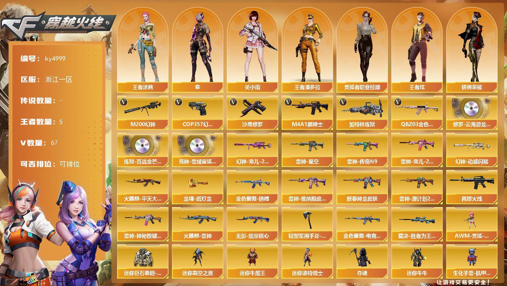[15746852]浙江一区-67V-5王者-0炫金 【热门武器】:QBZ03-金色蔷薇,M200-幻神,M4A1-黑骑士,加特林-炼狱,COP 357-幻灵,沙鹰-修罗*3 【音效卡】:修罗-云海游龙音效卡,炼狱-百战金芒-庆典舞曲音效卡,死神-雪域霜狐-怀旧音效卡 【皮肤】:幻神-宠儿-2021MVP,幻神-动感闪耀 皮肤,QBZ03-金色蔷薇-拼搏,金色蔷薇-电竞之星 皮肤,裁决-胜者为王 皮肤,雷神-星空,雷神-传奇N9,雷神-宠儿-2019MVP,雷神-维纳斯皮肤,M4A1-雷神-新春神龙皮肤,雷神-源计划2.0专属 皮肤,M4A1-再燃火线,雷神-神秘按键 皮肤,火麒麟-雷神,火麒麟-平天大圣,无影-能量核心,龙啸-纸灯龙皮肤,轻型军用手斧-再燃火线 【角色】:关小雨,隼,战地猎狐,王者炫,王者涂鸦,王者潘多拉,雪域霜狐,蛇隐宗,乔伊教练,云海玲珑,暗夜-X,初恋灵狐,电竞少女,芳心审判者,嘉年华灵狐,娟娟,兰妹妹,猎狐者-追月,0号玩家,灵狐者-X,灵狐者-七夕宝贝,灵狐者-职业经理,龙儿-小淘气,麻雀,曼陀罗-X,萌儿,娜塔莉娅,潘多拉-X,潘多拉-甜心教官,蛇姬,斯沃特-X,铁骑荣耀,兔囡囡,维纳斯,新娜塔莎,雪莉杨-摸金校尉,樱-战斗天使,影武者-X,游珑儿,智影 【人偶武器】:斯泰尔-枪娘暗刃,街机小灰机,AWM-灵狐-15周年嘉年华,迷你裂空之翼,迷你牛魔王,迷你波特博士,夺魂,迷你牛牛,生化手雷-机甲核心,深渊终结者手雷*3,迷你巨石泰坦-魔花研究所 【暴走生化】:KAC-狂怒咆哮,黑龙吞噬者,双面神 【挑战大师】:冰龙粉碎者-白马银枪,激光毁灭者III-白马银枪,神圣爆裂者-末日III 【英雄级武器】:AK47-火麒麟,M4A1-雷神,M4A1-黑骑士,无影-神兵利器,黑武士-锦绣游龙,死神-雪域霜狐,QBZ03-金色蔷薇,烈火-动感闪耀,QBZ-03-王者蔷薇-觉醒版,白虎之魄-觉醒版,AWM-裁决,M200-幻神,加特林-炼狱,炼狱-百战金芒,炼狱-悦蓝-觉醒版,烈龙-云海游龙,沙鹰-修罗*3,COP-雷霆,COP 357-幻灵,柯尔特-电竞之星,USP-冥王,天神-动感闪耀,龙啸,幻灵之锋*2,屠龙-动感闪耀,擎天-云海游龙,麒麟刺-百战金芒,高爆手雷-幻灵*7,高爆手雷-竞技荣光*2,手雷-动感闪耀,手雷-云海游龙,高爆手雷-古蛇迷踪,闪光弹-幻灵