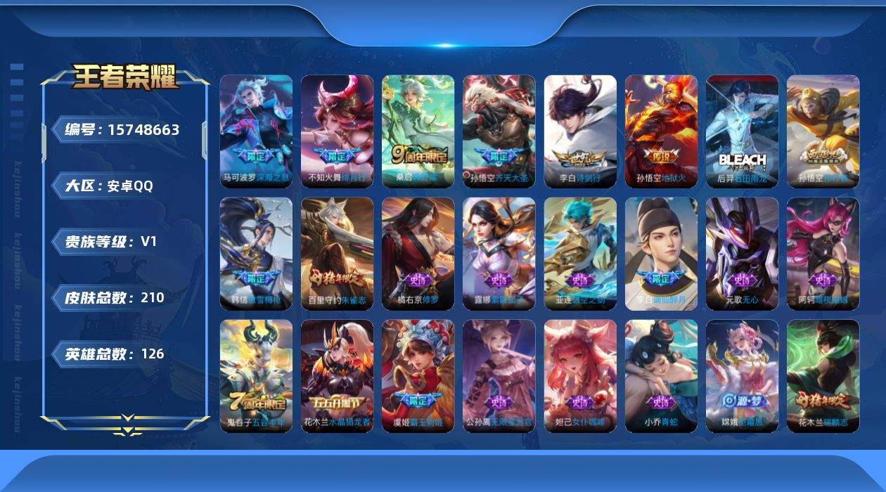 - [11685483]V10 6典藏 4无双 58传说 126英雄 445皮肤 典藏英雄武则天 可修改实名 优质装备:倪克斯神谕(宇宙婆娘),杀手不太冷,全息碎影(猴子典藏),银白咏叹调(倪克斯侍卫),幻阙歌(貂蝉典藏),弑枪猎影(韩信典藏),神器·明辉仪,青丘·九尾(妲己无双),碎月剑心(李白无双),韩信群星魔术团(韩信无双),黄金狮子座,黄金射手座,冠军飞将,云鹰飞将(小将军),绛天战甲(鸡嘴战神),猫影幻舞,久胜战神,炽阳神光,一念神魔,云霓雀翎,末日机甲-孙尚香(绿蚂蚱),地狱火,仲夏夜之梦(大飞蛾),音你心动-小乔,地狱之眼,音你心动-周瑜,胖达荣荣,李逍遥,乞巧织情,时之恋人-刘备(电焊工),游龙清影(小青龙),淬星耀世,超时空战士-狄仁杰,无双飞将,碎云,神器·明辉仪,山海·炽霜斩(李信年限),山海·苍雷引(电光曜子),炽翼辉光(娃娃菜牛角包),燃星之曲,画中仙,青丘·九尾,鹤羽星尊,妄想实况,霜月吟,澜逐花归海,艾琳觅芳踪,琥珀纪元马超 传说皮:乘龙·问璇玑(孙尚香年限) 珍宝阁皮:优雅恋人,蔷薇恋人 限定皮:鸣野蒿,夏侯惇霜北刀,至尊宝,白虎志(电光耗子),凤求凰(白切鸡),太华(伽罗年限),异界灵契(白毛香),星穹之声,绯月行,白晶晶,时雨天司(水龙头),神威(电光马子),飞衡(韩信年限),无限倾心-项羽,至美·乘鲤谣,高山流水,诗剑行,无限倾心-虞姬,齐天大圣,怒海麟威,五谷丰年,冰锋战神,武圣,梁祝,烈魂,逐梦之音,祈雪灵祝(雪兔子),天狼绘梦者,李小龙,朱雀志(守约年限),纯白花嫁,孙行者,一生所爱,天魔缭乱,青春决赛季,冰霜恋舞曲,云端筑梦师,乒乒小将,寅虎·瑞焰(虎皮蛋子),寅虎·心曲(虎婆),启示之音,深海之息(深海大菠萝),山海·玄木吟(马可年限) 史诗皮:星界战将,灵蛊蚀心,海诺心动手记,蒙犽顽岩魄,埋骨钱,怒海争锋,蔬乡物语(鲁班七号),超元猎域,琥珀纪元伽罗,遇见神鹿,紫霞仙子,苍穹之光,电玩小子(小书包),白龙吟,黄金分割率,特工魅影,千年之狐,永昼,电玩·爆裂旋风,真我赫兹(镜),浮梦罗烟,真我赫兹(百里守约),江河有灵,雪夜绮愿(周瑜),百解令(蒙犽),高渐离燃音魔法,蒙恬荣光圣徽,偶像歌手,龙骑士(小龙虾),白蛇,暗夜猫娘,魅语,无限星赏官,晚萤,冰冠公主,青蛇,末日机甲-吕布,猫狗日记-孙策,猫狗日记-大乔,时之恋人-孙尚香,乱世虎臣