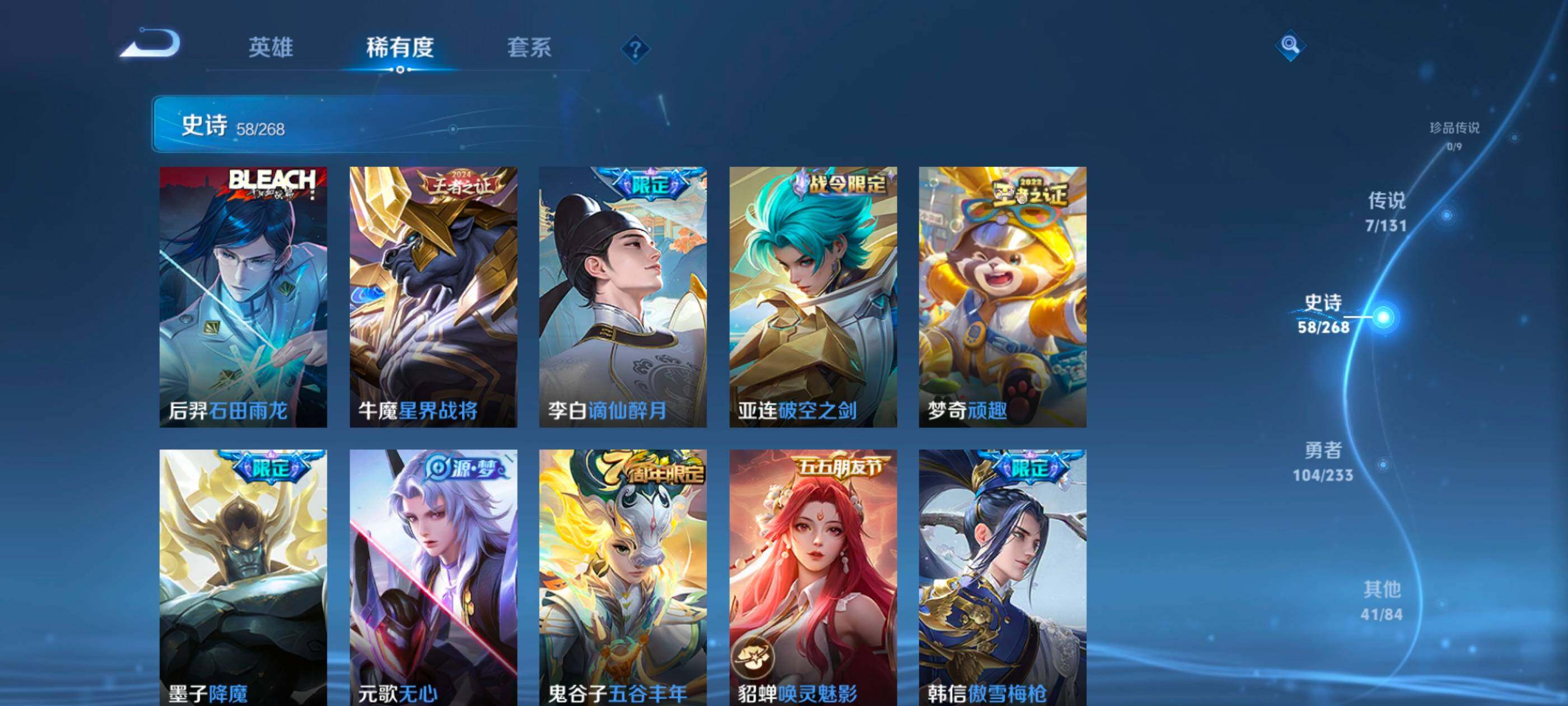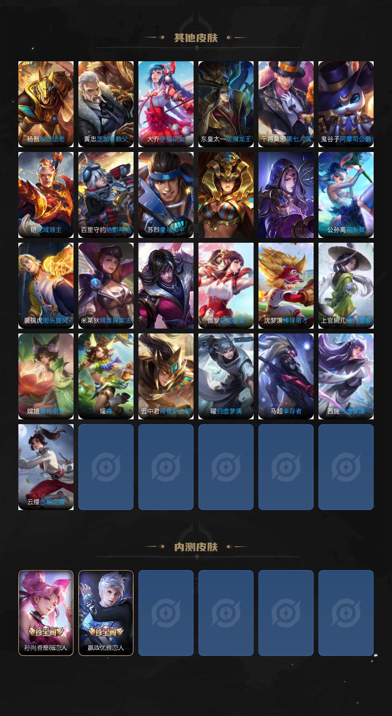 上官婉儿梁祝,花木兰瑞麟志,百里守约朱雀志,虞姬霸王别姬,孙悟空孙行者,韩信傲雪梅枪,马可波罗深海之息,不知火舞绯月行,墨子降魔,李白诗剑行,桑启鸣野蒿