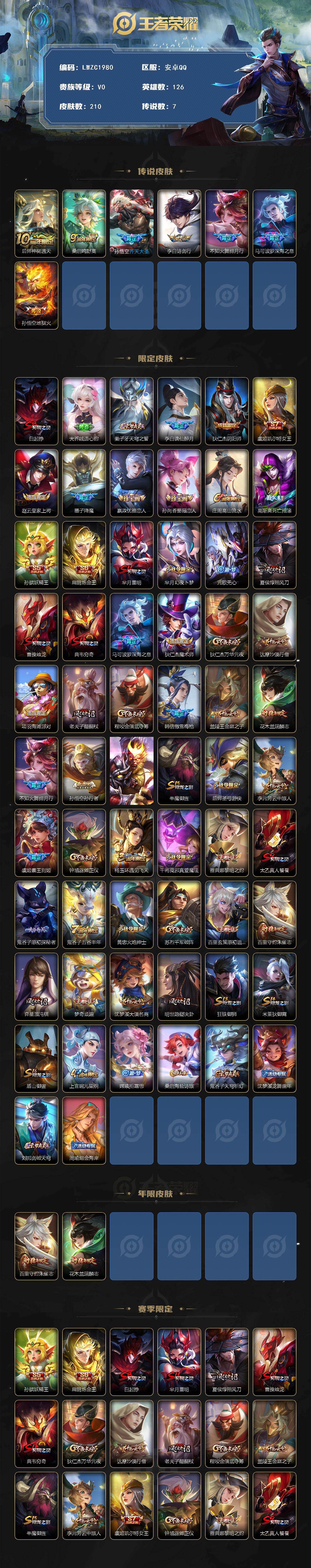 [15748663]可二次【特价出售/店主推荐】安卓Q-V0-永恒钻石IV段位-126英雄-210皮肤-7传说-58史诗