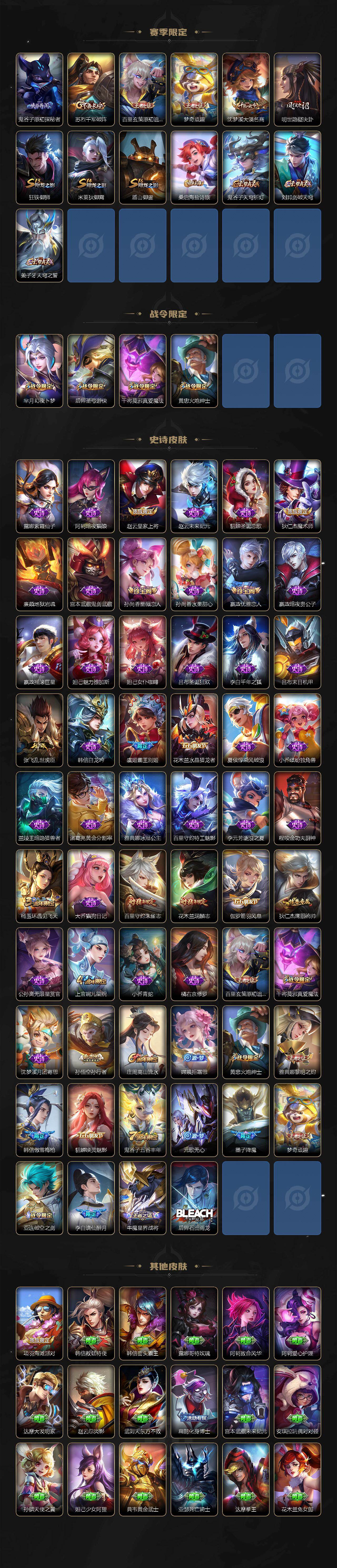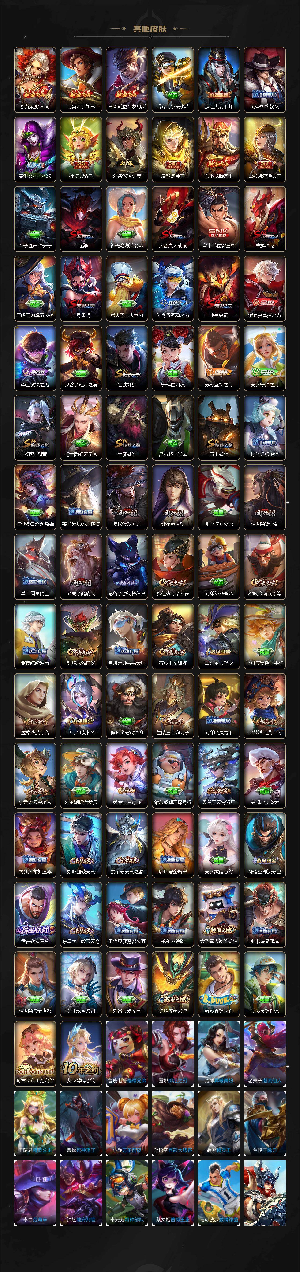 【赛季限定】:孙膑妖精王,扁鹊炼金王,白起狰,芈月重明,夏侯惇朔风刀,曹操烛龙,典韦穷奇,狄仁杰万华元夜,达摩沙漠行僧,老夫子醍醐杖,程咬金演武夺筹,兰陵王金庭之子,牛魔御旌,李元芳云中旅人,虞姬凯尔特女王,钟馗驱傩正仪,雅典娜黎明之约,太乙真人饕餮,鬼谷子原初探秘者,苏烈千军破阵,百里玄策原初追逐者,弈星混沌棋,梦奇顽趣,沈梦溪大漠名商,明世隐疑决卦,狂铁御狮,米莱狄御霄,盾山御銮,桑启海盐诗旅,鬼谷子天穹祈灯,刘邦剑破天穹,姜子牙天穹之誓