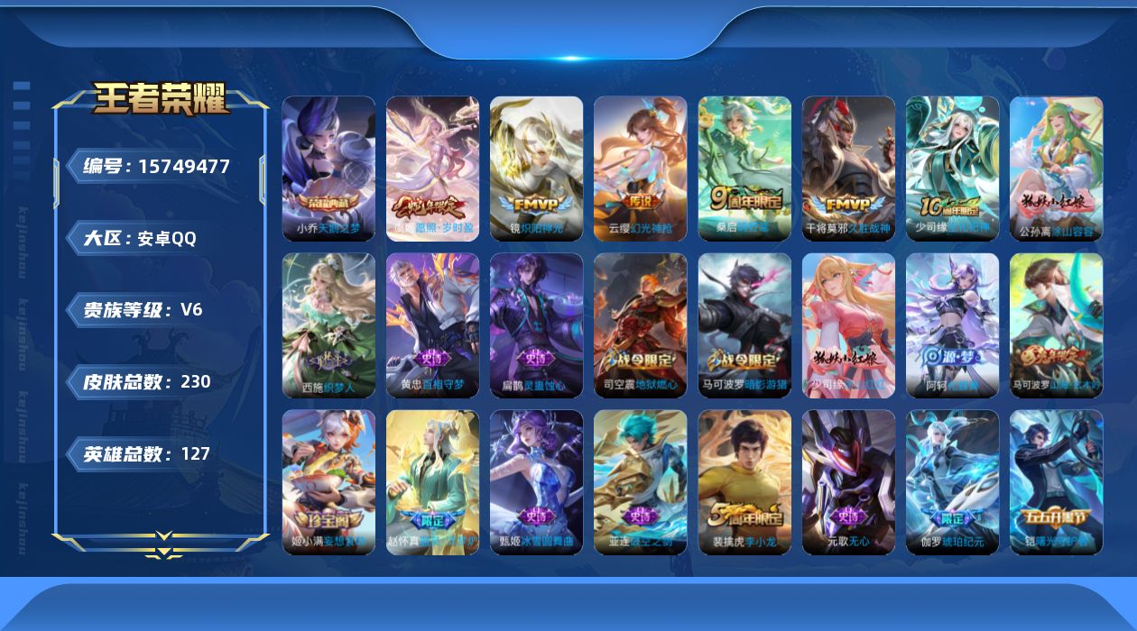 [15749477]可二次【特价急出/详情看图】安卓Q-V6-最强王者段位-127英雄-230皮肤-1典藏皮肤-5传说-72史诗