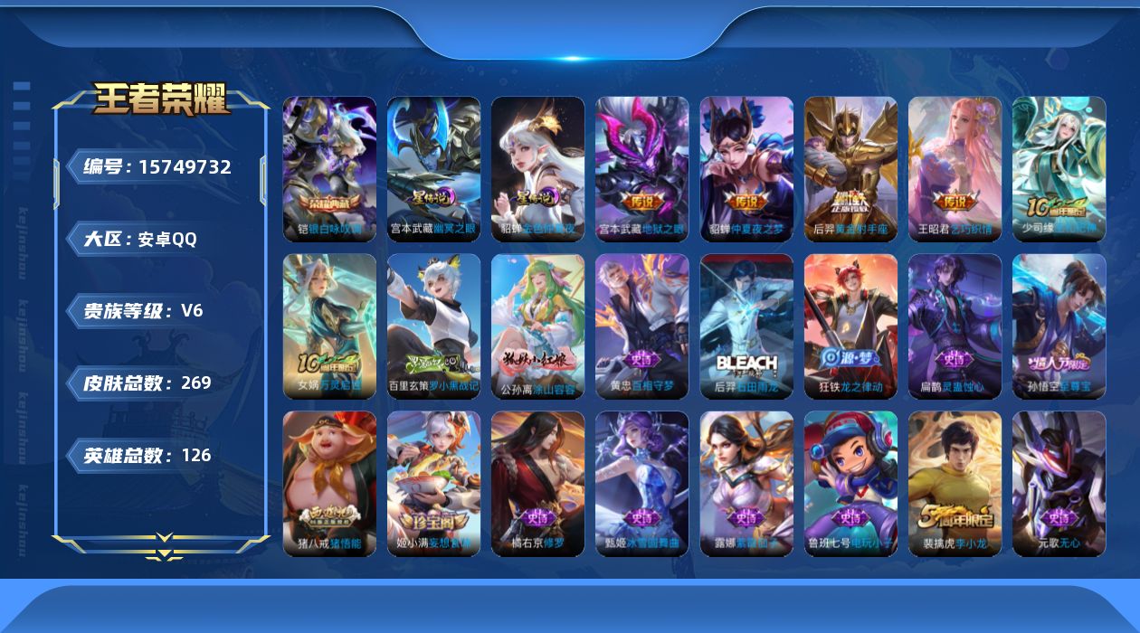 [15749732]【特价出售/店主推荐】安卓Q-V6-最强王者段位-126英雄-269皮肤-1典藏皮肤-2星传说-5传说-72史诗
