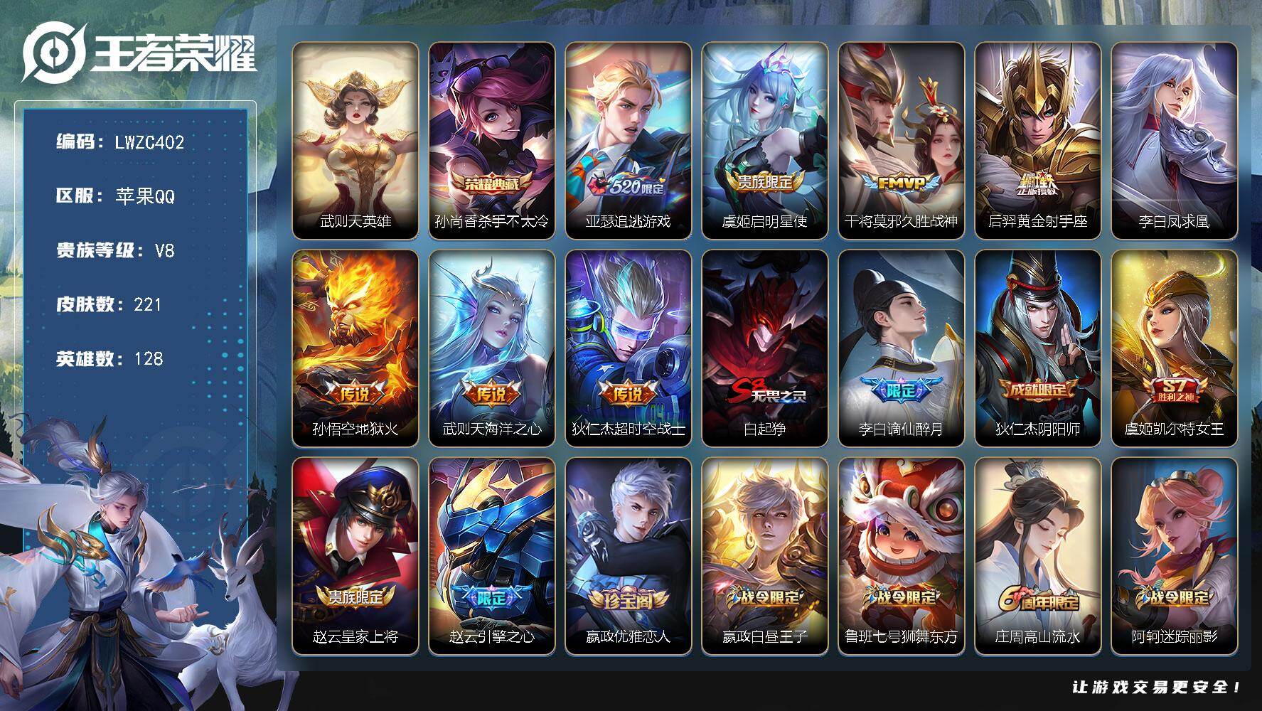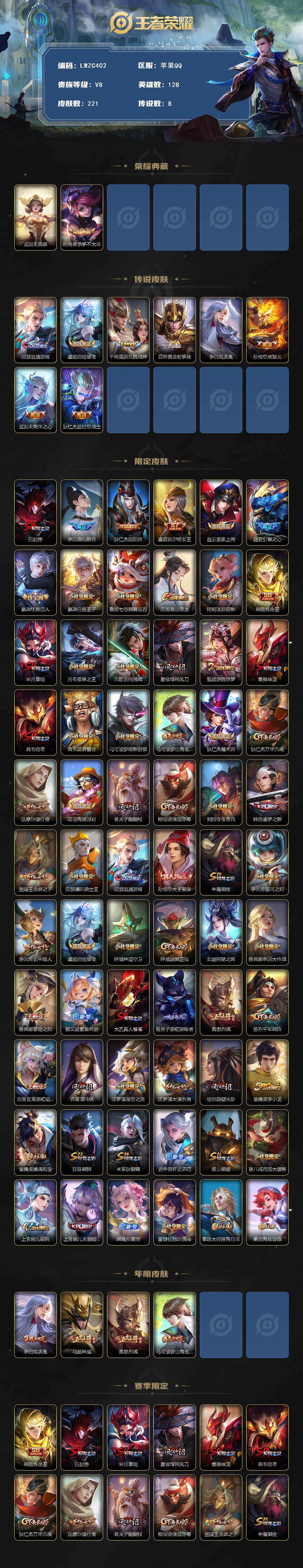 [15749897]【特价出售/店主推荐/1省标/2市标】:苹果Q-V8-永恒钻石II段位-128英雄-221皮肤-1典藏皮肤-1典藏英雄-8传说-58史诗