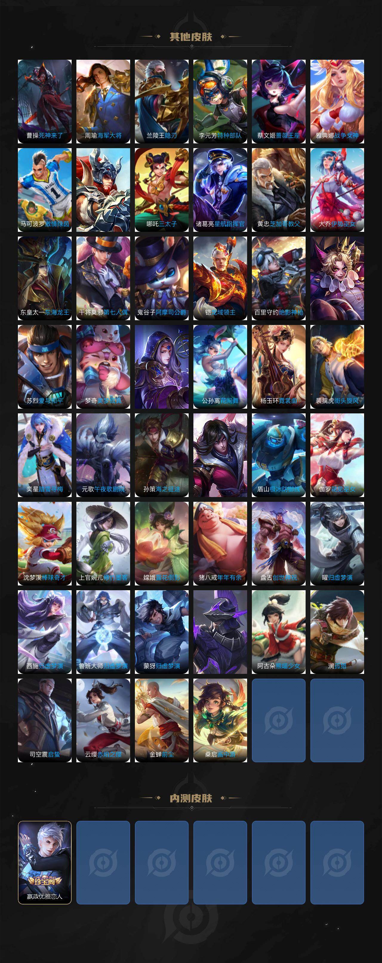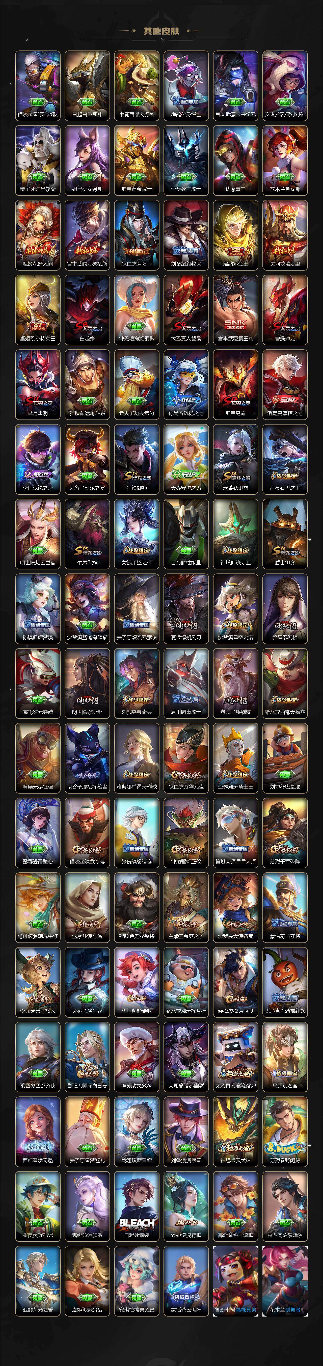 扁鹊炼金王,虞姬凯尔特女王,白起狰,太乙真人饕餮,曹操烛龙,芈月重明,典韦穷奇,狂铁御狮,米莱狄御霄,牛魔御旌,盾山御銮,夏侯惇朔风刀,明世隐疑决卦,老夫子醍醐杖,鬼谷子原初探秘者,狄仁杰万华元夜,程咬金演武夺筹,钟馗驱傩正仪,苏烈千军破阵,吕布猎兽之王,嬴政白昼王子,女娲朔望之晖,典韦蓝屏警告,钟馗神迹守卫,鲁班七号狮舞东方,沈梦溪星空之诺,李元芳银河之约,刘邦夺宝奇兵,马可波罗暗影游猎,蒙犽狂想玩偶喵,元歌云间偶戏,弈星混沌棋,达摩沙漠行僧,兰陵王金庭之子,沈梦溪大漠名商,李元芳云中旅人,桑启海盐诗旅,裴擒虎擒涛扼浪,鲁班大师探海日志