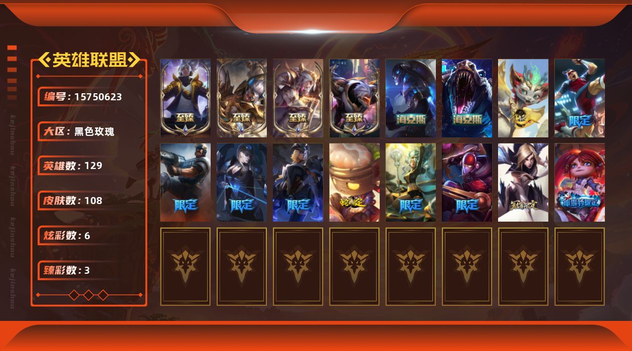 [15750623]可二次【特价出售/店主推荐】未定级段位-129英雄-108皮肤-6炫彩-0终极-7神话-12限定-16传说-29史诗