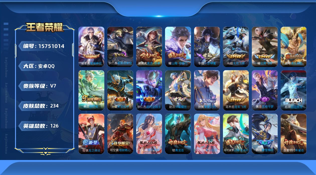 [15751014]【店主推荐捡漏号!可直接换绑】安卓Q-V7-最强王者段位-126英雄-234皮肤-1典藏皮肤-12传说-66史诗