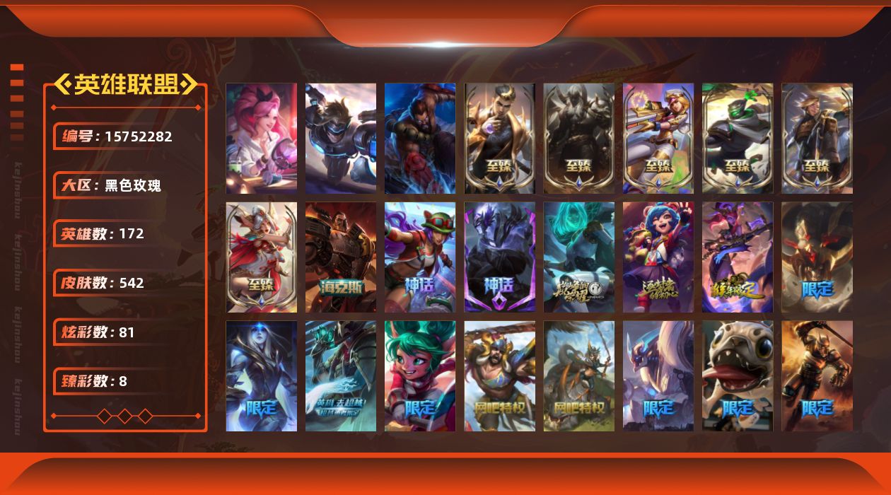 [15752282]白银段位-172英雄-542皮肤-81炫彩-5终极-11神话-107限定-63传说-63史诗 【至臻皮肤】:至臻征服者贾克斯,至臻电玩女神凯特琳,至臻灵能特工伊泽瑞尔,至臻T1杰斯,至臻腥红之月亚托克斯,至臻神凰行者烈羽焰凰霞 【臻彩皮肤】:玉净夜叉凯特琳炫金神机,冠军之刃锐雯2016凯旋圣装,冠军之矛卡莉丝塔凯旋圣装,神龙尊者圣龙李青登龙,可爱可爱粉红红布里茨,星之守护者阿卡丽热情之光,红莲之刃锐雯 【年限皮肤】:玉净夜叉凯特琳 【海克斯皮肤】:恐惧新星德莱厄斯 【情人节限定】:甜心宝贝安妮,甜心之羽霞,碎心之拳蔚,觅心萝莉金克丝,觅心猎手薇恩,觅心之翼奎因,觅心游侠卢锡安,觅心魔灵奥莉安娜,幽梦玫瑰泰隆,水晶玫瑰婕拉,水晶玫瑰阿克尚 【冰雪限定】:持胡萝卜的雪人易,圣诞开心鬼提莫,圣诞狂欢努努和威朗普,狂心冰王图奇,阿木木“主人不要我了”,冰封王子蒙多,平安夜女神娑娜,英勇玩具兵普朗克,夺命美人卡特琳娜,冬季仙境奥莉安娜,雪默丁格,雪装奈德丽,冰雪驯鹿波比,圣诞老人古拉加斯,魄罗骑士瑟庄妮,雪球也能爆炸吉格斯,寒冬精灵璐璐,圣诞老人德莱文,圣诞老人布隆,圣诞捣蛋鬼金克丝,冰雪节辛吉德,冰雪节格雷福斯,冰雪女神辛德拉,北极星使者沃里克,北极星圣贤基兰,北极星使者萨科,北极星神黛安娜 【终极皮肤】:KDAALLOUT萨勒芬妮独立音乐人,灵魂守卫乌迪尔,未来战士伊泽瑞尔 【神话皮肤】:十周年纪念安妮,源代码乐芙兰,十五周年纪念希维尔,灰烬杀手塞拉斯,恐惧新星德莱厄斯,至臻征服者贾克斯,至臻电玩女神凯特琳,至臻灵能特工伊泽瑞尔,至臻神凰行者烈羽焰凰霞,至臻腥红之月亚托克斯 【限定皮肤】:冰原核弹古拉加斯,舞会公主安妮,创星之灵璐璐,地底世界崔斯特,冠军之血希瓦娜,冠军之矛卡莉丝塔,冠军之箭艾希,冠军掠夺者卡兹克,暗杀星蒙多,SKTT1贾克斯,SKTT1婕拉,SKTT1李青,SSW图奇,SSW锤石,SKTT1阿利斯塔,SKTT1艾克,SKTT1扎克,SSG塔莉垭,SSG洛,SSG霞,iG卡莎,FPX薇恩,FPX锤石,EDG格雷福斯,暗裔英雄盖伦,胜利枪神格雷福斯,胜利枪神卢锡安,胜利巨口克格莫,胜利女神娑娜,胜利剑圣易,胜利之运崔斯特,胜利女神菲奥娜,南瓜头费德提克,鬼影重重魔腾,鬼影森森茂凯,无头骑士赫卡里姆,克烈古拉伯爵,不给糖就捣蛋艾克,魅惑女巫乐芙兰,魅惑女巫崔