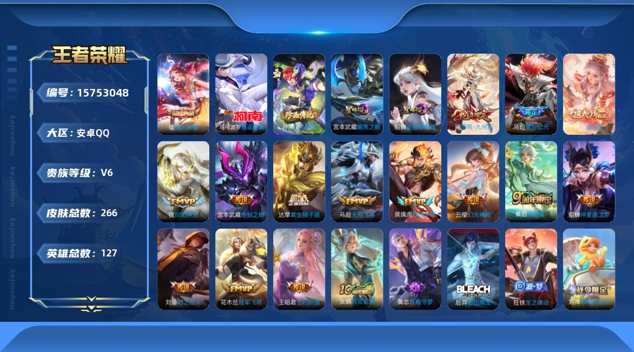 [15753048]【特价急出/详情看图】安卓Q-V6-最强王者段位-127英雄-266皮肤-1典藏皮肤-2珍品传说-3星元-14传说-84史诗