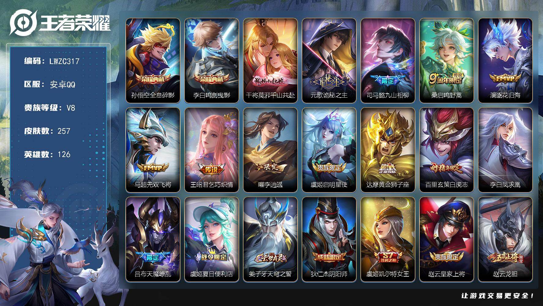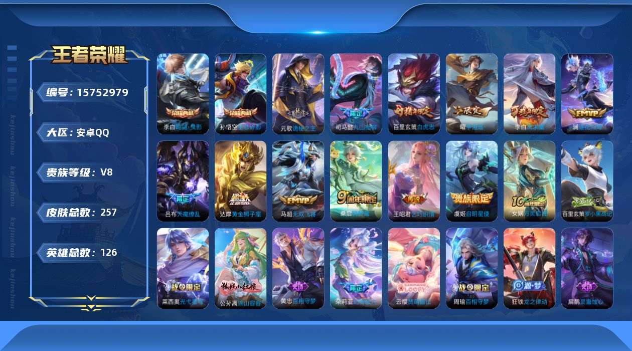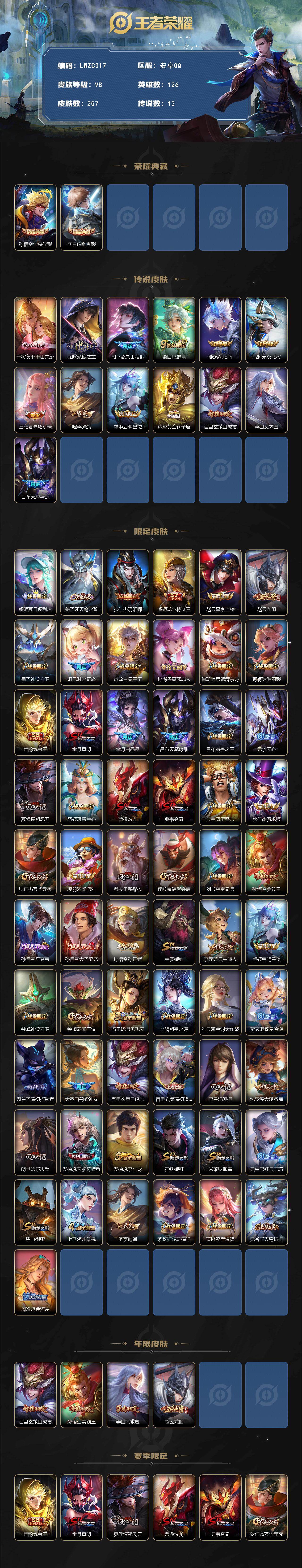 [15752979]【特价急出/详情看图】安卓Q-V8-最强王者段位-126英雄-257皮肤-2典藏皮肤-13传说-71史诗