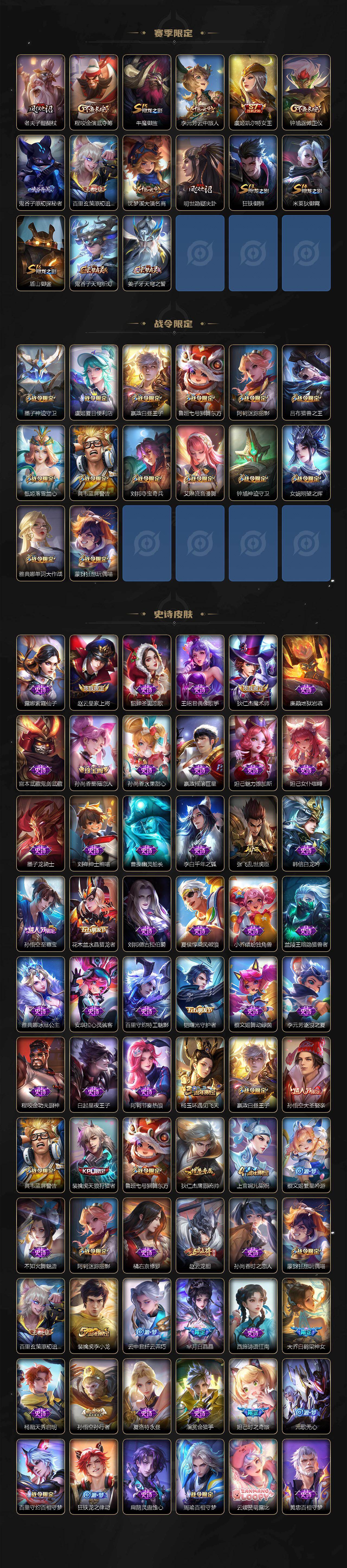【赛季限定】:扁鹊炼金王,芈月重明,夏侯惇朔风刀,曹操烛龙,典韦穷奇,狄仁杰万华元夜,老夫子醍醐杖,程咬金演武夺筹,牛魔御旌,李元芳云中旅人,虞姬凯尔特女王,钟馗驱傩正仪,鬼谷子原初探秘者,百里玄策原初追逐者,弈星混沌棋,沈梦溪大漠名商,明世隐疑决卦,狂铁御狮,米莱狄御霄,盾山御銮,鬼谷子天穹祈灯,姜子牙天穹之誓