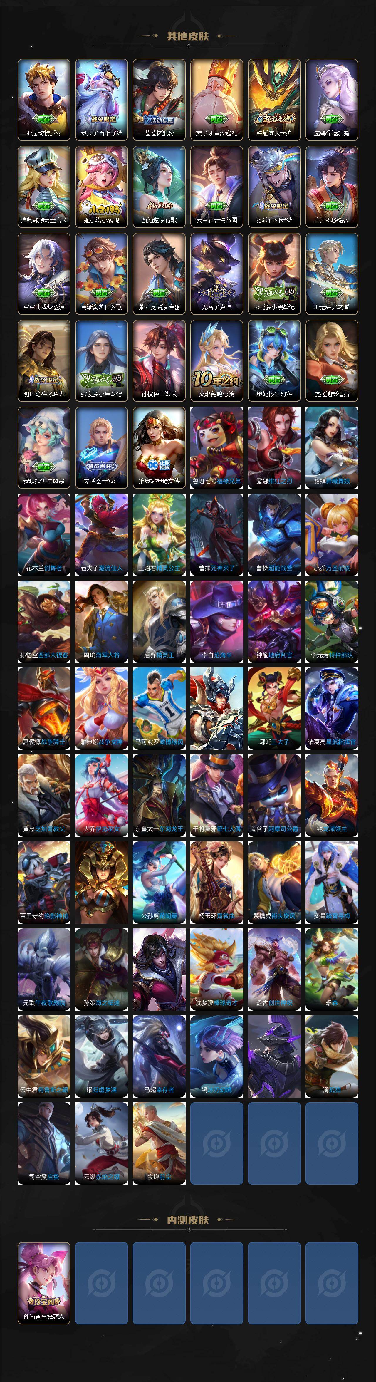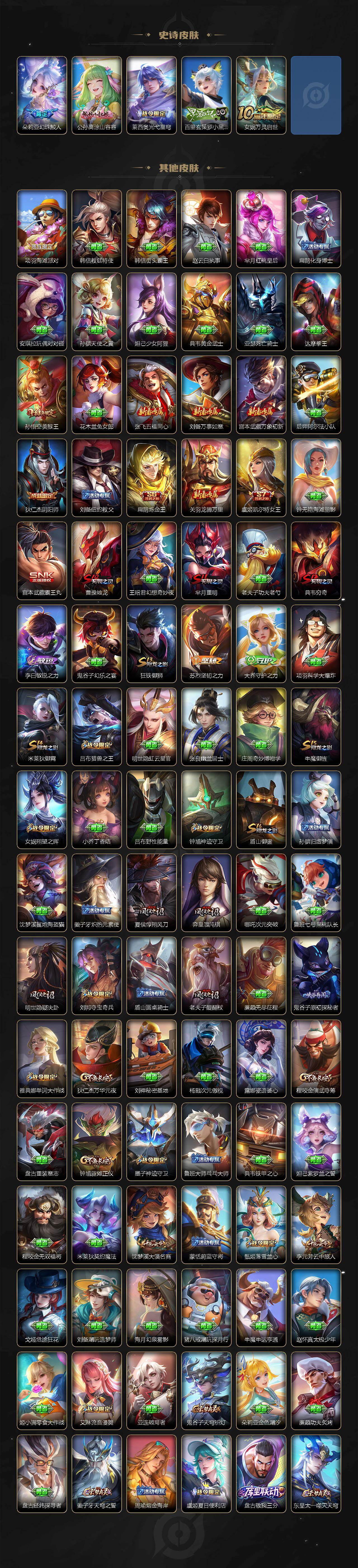 【限定皮肤】:虞姬夏日便利店,姜子牙天穹之誓,狄仁杰阴阳师,虞姬凯尔特女王,赵云皇家上将,赵云龙胆,墨子神迹守卫,妲己时之奇旅,嬴政白昼王子,孙尚香蔷薇恋人,鲁班七号狮舞东方,阿轲迷踪丽影,扁鹊炼金王,芈月重明,芈月白晶晶,吕布天魔缭乱,吕布猎兽之王,元歌无心,夏侯惇朔风刀,甄姬落雪兰心,曹操烛龙,典韦穷奇,典韦蓝屏警告,狄仁杰魔术师,狄仁杰万华元夜,项羽海滩派对,老夫子醍醐杖,程咬金演武夺筹,刘邦夺宝奇兵,孙悟空美猴王,孙悟空至尊宝,孙悟空大圣娶亲,孙悟空孙行者,牛魔御旌,李元芳云中旅人,虞姬启明星使,钟馗神迹守卫,钟馗驱傩正仪,杨玉环遇见飞天,女娲朔望之晖,雅典娜单词大作战,蔡文姬繁星吟游,鬼谷子原初探秘者,大乔白鹤梁神女,百里玄策白虎志,百里玄策原初追逐者,弈星混沌棋,沈梦溪大漠名商,明世隐疑决卦,裴擒虎天狼狩猎者,裴擒虎李小龙,狂铁御狮,米莱狄御霄,云中君纤云弄巧,盾山御銮,上官婉儿梁祝,曜李逍遥 ,蒙犽狂想玩偶喵,艾琳流音漫舞,鬼谷子天穹祈灯,周瑜熔金海岸