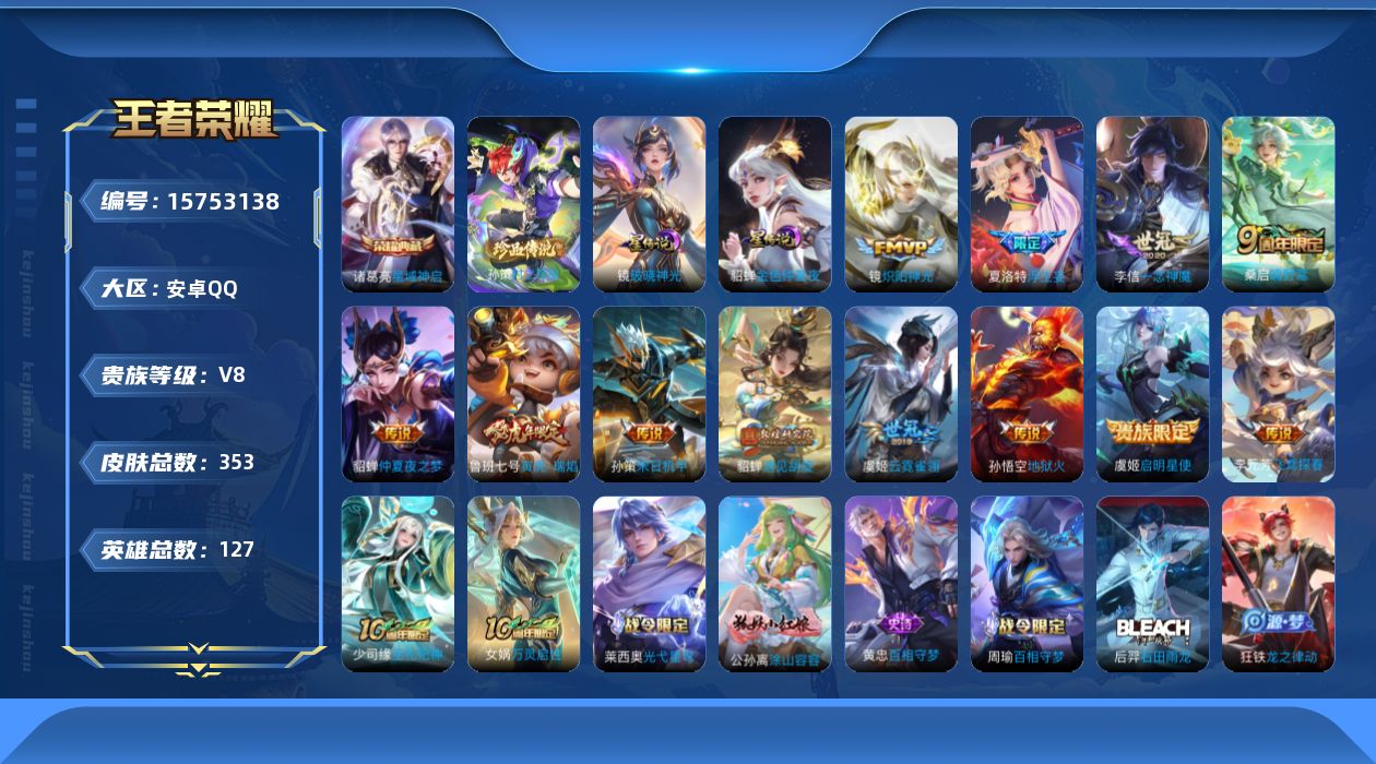- [12634663]安卓Q-V7-最强王者段位-124英雄-219皮肤-1典藏-0珍品无双-0无双-0珍品传说-7传说-69史诗 【荣耀典藏】:孙尚香杀手不太冷 【传说皮肤】:虞姬愿照岁时盈,云缨幻光神枪,桑启鸣野蒿,鲁班七号时之奇旅,张良黄金白羊座,干将莫邪久胜战神,狄仁杰超时空战士 【限定皮肤】:虞姬夏日便利店,狄仁杰阴阳师,赵云皇家上将,嬴政白昼王子,孙尚香蔷薇恋人,鲁班七号时之奇旅,庄周高山流水,高渐离死亡摇滚,高渐离玩趣恶龙,阿轲迷踪丽影,钟无艳超时空战士,吕布猎兽之王,周瑜赤莲之焰,夏侯惇朔风刀,甄姬游园惊梦,甄姬落雪兰心,典韦穷奇,马可波罗暗影游猎,狄仁杰魔术师,狄仁杰万华元夜,达摩沙漠行僧,项羽海滩派对,老夫子醍醐杖,程咬金演武夺筹,刘邦夺宝奇兵,王昭君午后时光,兰陵王金庭之子,孙悟空至尊宝,牛魔御旌,李元芳银河之约,李元芳匿光侦查者,李元芳云中旅人,钟馗驱傩正仪,杨玉环遇见飞天,雅典娜单词大作战,雅典娜黎明之约,蔡文姬繁星吟游,鬼谷子原初探秘者,鬼谷子五谷丰年,苏烈千军破阵,弈星混沌棋,梦奇顽趣,沈梦溪星空之诺,沈梦溪大漠名商,明世隐疑决卦,裴擒虎李小龙,裴擒虎擒涛扼浪,狂铁御狮,狂铁电玩高手,米莱狄御霄,米莱狄胡桃异想国,猪八戒西部大镖客,上官婉儿梁祝,嫦娥暖冬兔眠,蒙犽狂想玩偶喵,鲁班大师探海日志,桑启海盐诗旅,暃星界游侠,艾琳流音漫舞,司空震地狱燃心,阿古朵江河有灵,张良古海寻踪,鬼谷子天穹祈灯,沈梦溪龙舞盛年,刘邦剑破天穹,程咬金群星魔术团,关羽决胜骁骑,刘备异域游侠,芈月浮光幕影,周瑜熔金海岸 【赛季限定】:夏侯惇朔风刀,典韦穷奇,狄仁杰万华元夜,达摩沙漠行僧,老夫子醍醐杖,程咬金演武夺筹,兰陵王金庭之子,张良古海寻踪,牛魔御旌,李元芳云中旅人,钟馗驱傩正仪,雅典娜黎明之约,鬼谷子原初探秘者,苏烈千军破阵,弈星混沌棋,梦奇顽趣,沈梦溪大漠名商,明世隐疑决卦,裴擒虎擒涛扼浪,狂铁御狮,米莱狄御霄,鲁班大师探海日志,桑启海盐诗旅,鬼谷子天穹祈灯,刘邦剑破天穹 【战令限定】:虞姬夏日便利店,嬴政白昼王子,阿轲迷踪丽影,钟无艳超时空战士,吕布猎兽之王,周瑜赤莲之焰,甄姬落雪兰心,马可波罗暗影游猎,刘邦夺宝奇兵,王昭君午后时光,艾琳流音漫舞,李元芳银河之约,雅典娜单词大作战,沈梦溪星空之诺,狂铁电玩高手,米莱狄胡桃异想国,猪八戒西部大镖客,嫦娥暖冬兔眠,蒙犽狂想玩偶
