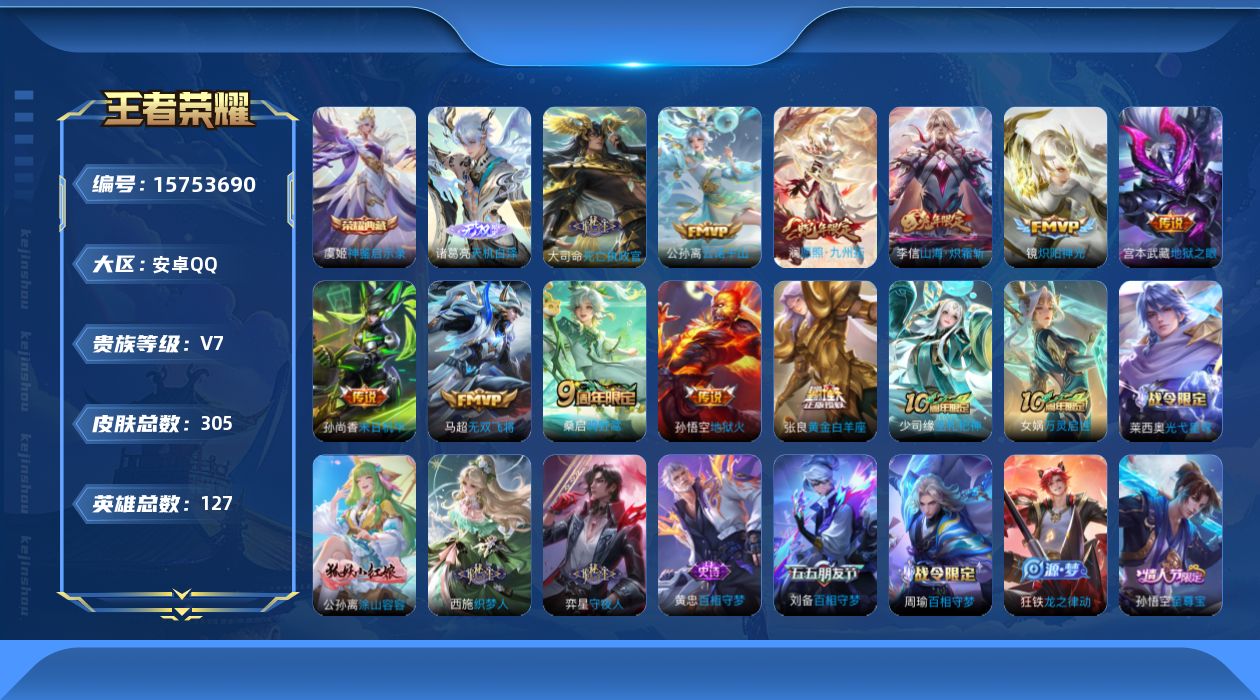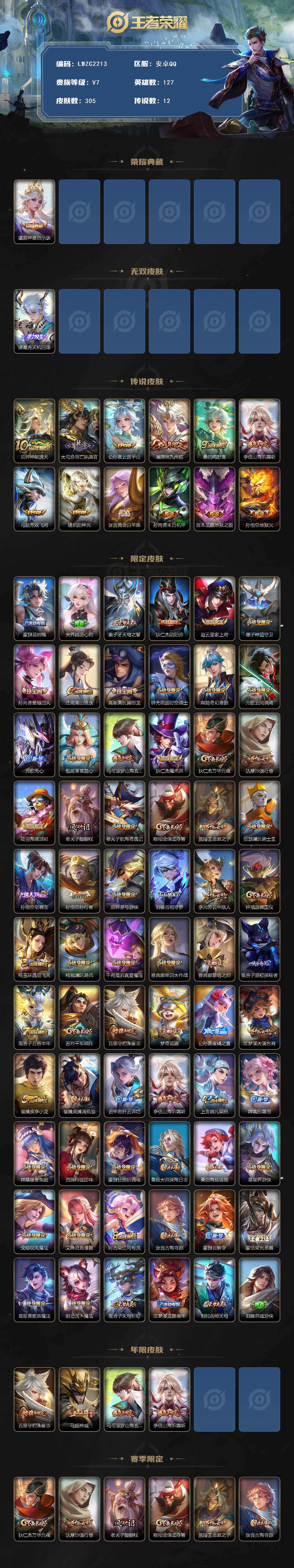 [15753690]账号来源干净 保证账号找回包赔 薄利多销 冲销量 平台保证金向商家 安卓Q-V7-最强王者段位-127英雄-305皮肤-1典藏皮肤-1无双-12传说-91史诗【英雄全皮】:孙权全皮,戈娅全皮,影全皮【荣耀典藏】:虞姬神鉴启示录【无双皮肤】:诸葛亮天机白泽【传说皮肤】:后羿神树通天,大司命死亡执政官,公孙离云诺千山,澜愿照九州拓,桑启鸣野蒿,李信山海炽霜斩,马超无双飞将,镜炽阳神光,张良黄金白羊座,孙尚香末日机甲,宫本武藏地狱之眼,孙悟空地狱火【限定皮肤】:蒙犽顽岩魄,大乔绒语心约,姜子牙天穹之誓,狄仁杰阴阳师,赵云皇家上将,墨子神迹守卫,孙尚香蔷薇恋人,庄周高山流水,高渐离玩趣恶龙,钟无艳超时空战士,扁鹊奇幻香踪,元歌云间偶戏,元歌无心,甄姬落雪兰心,马可波罗山海玄木吟,狄仁杰魔术师,狄仁杰万华元夜,达摩沙漠行僧,项羽海滩派对,老夫子醍醐杖,老夫子航海奇遇记,程咬金演武夺筹,兰陵王金庭之子,亚瑟潮玩骑士王,孙悟空至尊宝,孙悟空孙行者,后羿圣弓游侠,刘备百相守梦,李元芳云中旅人,钟馗驱傩正仪,杨玉环遇见飞天,杨戬潮玩骑兵,干将莫邪真爱魔法,雅典娜单词大作战,雅典娜黎明之约,鬼谷子原初探秘者,鬼谷子五谷丰年,苏烈千军破阵,百里守约朱雀志,梦奇顽趣,公孙离蜜橘之夏,沈梦溪大漠名商,裴擒虎李小龙,裴擒虎擒涛扼浪,云中君纤云弄巧,李信山海炽霜斩,上官婉儿梁祝,嫦娥拒霜思,嫦娥暖冬兔眠,西施玲珑珍味,蒙犽狂想玩偶喵,鲁班大师探海日志,桑启海盐诗旅,暃星界游侠,戈娅驭风魔法,艾琳流音漫舞,阿古朵江河有灵,张良古海寻踪,蒙犽百解令,蒙恬荣光圣徽,高渐离燃音魔法,妲己灵卜魔法,鬼谷子天穹祈灯,沈梦溪龙舞盛年,刘邦剑破天穹,刘备异域游侠