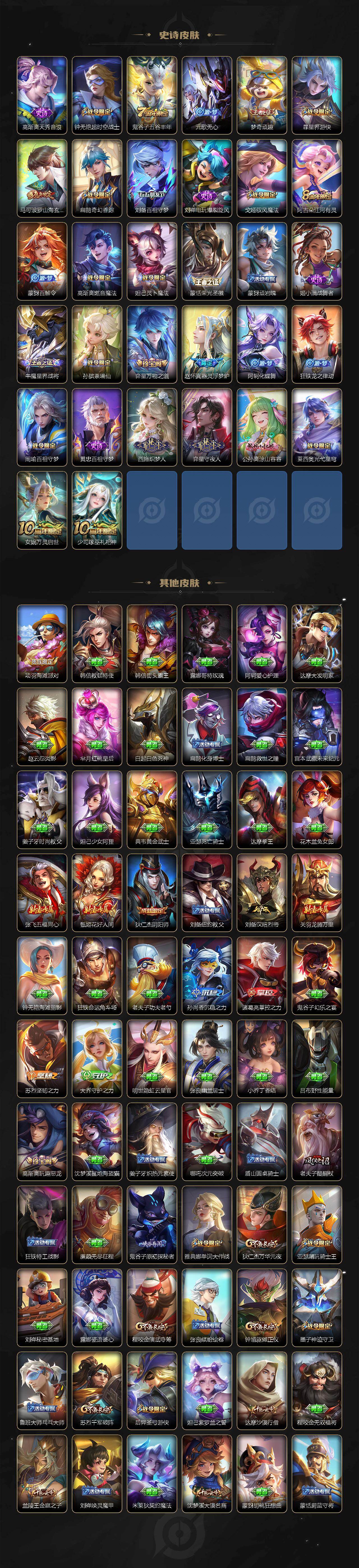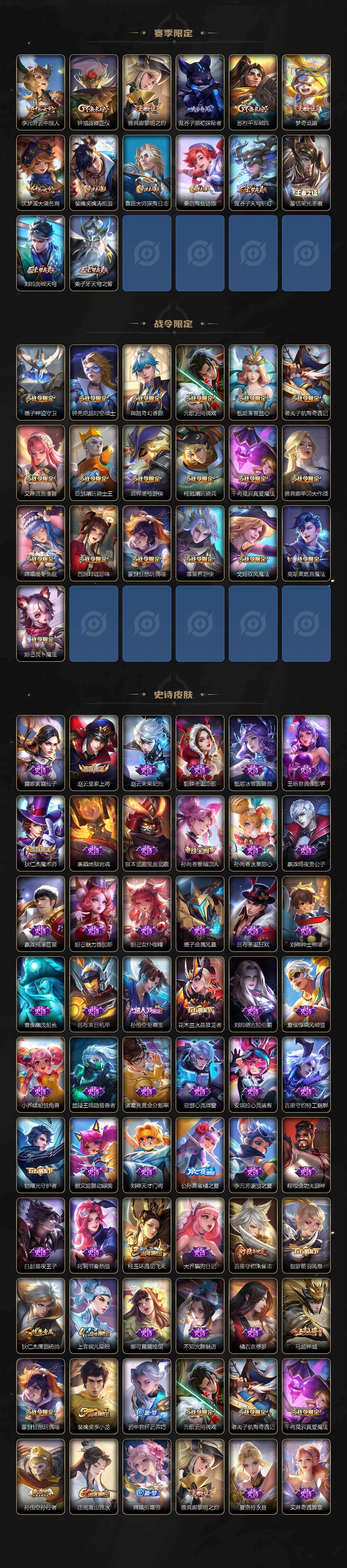 【赛季限定】:狄仁杰万华元夜,达摩沙漠行僧,老夫子醍醐杖,程咬金演武夺筹,兰陵王金庭之子,张良古海寻踪,李元芳云中旅人,钟馗驱傩正仪,雅典娜黎明之约,鬼谷子原初探秘者,苏烈千军破阵,梦奇顽趣,沈梦溪大漠名商,裴擒虎擒涛扼浪,鲁班大师探海日志,桑启海盐诗旅,鬼谷子天穹祈灯,蒙恬荣光圣徽,刘邦剑破天穹,姜子牙天穹之誓