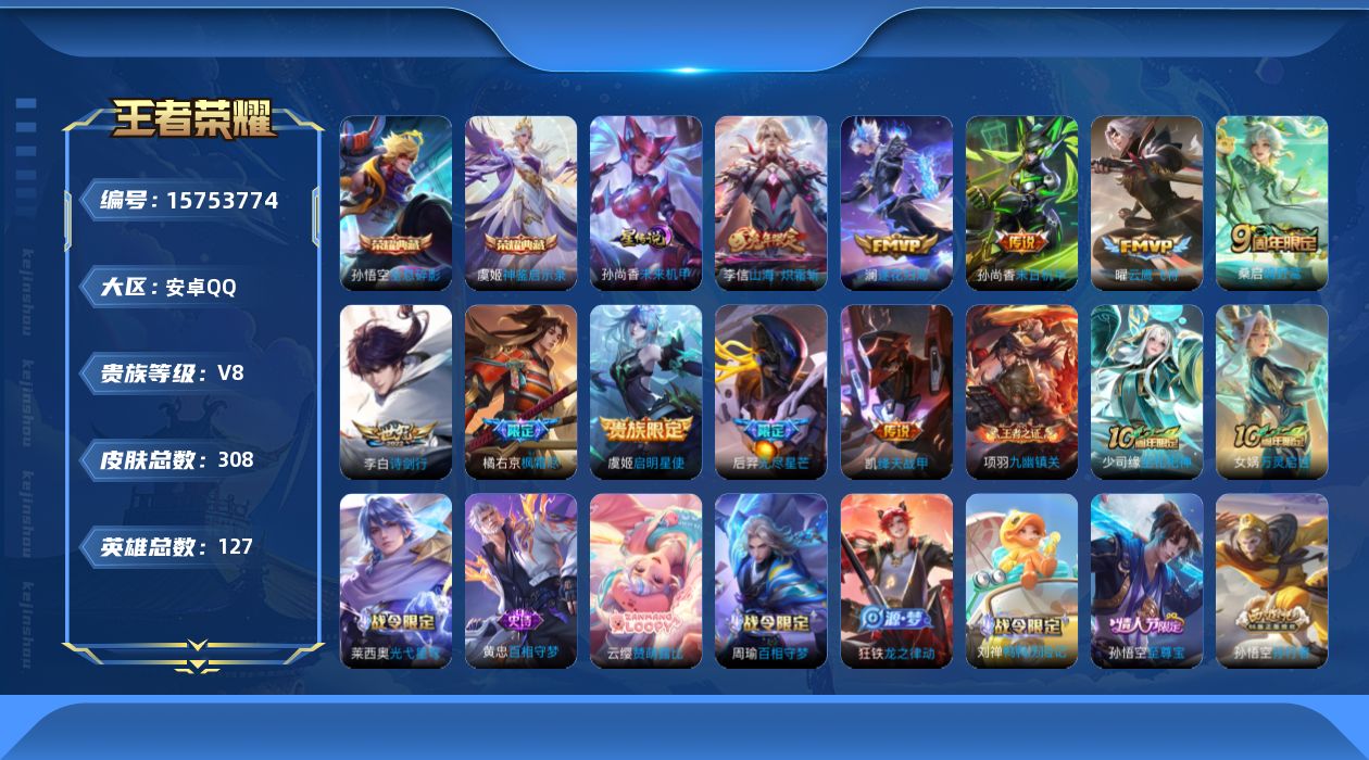 [15753774]【特价出售/店主推荐/1市标】:安卓Q-V8-最强王者段位-127英雄-307皮肤-2典藏皮肤-11传说-90史诗-1星源