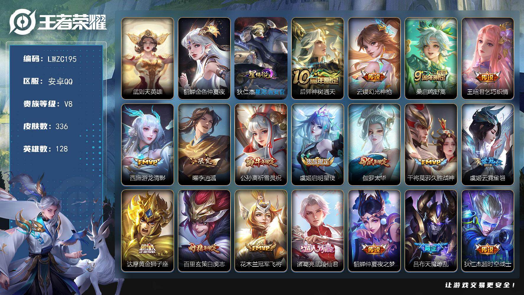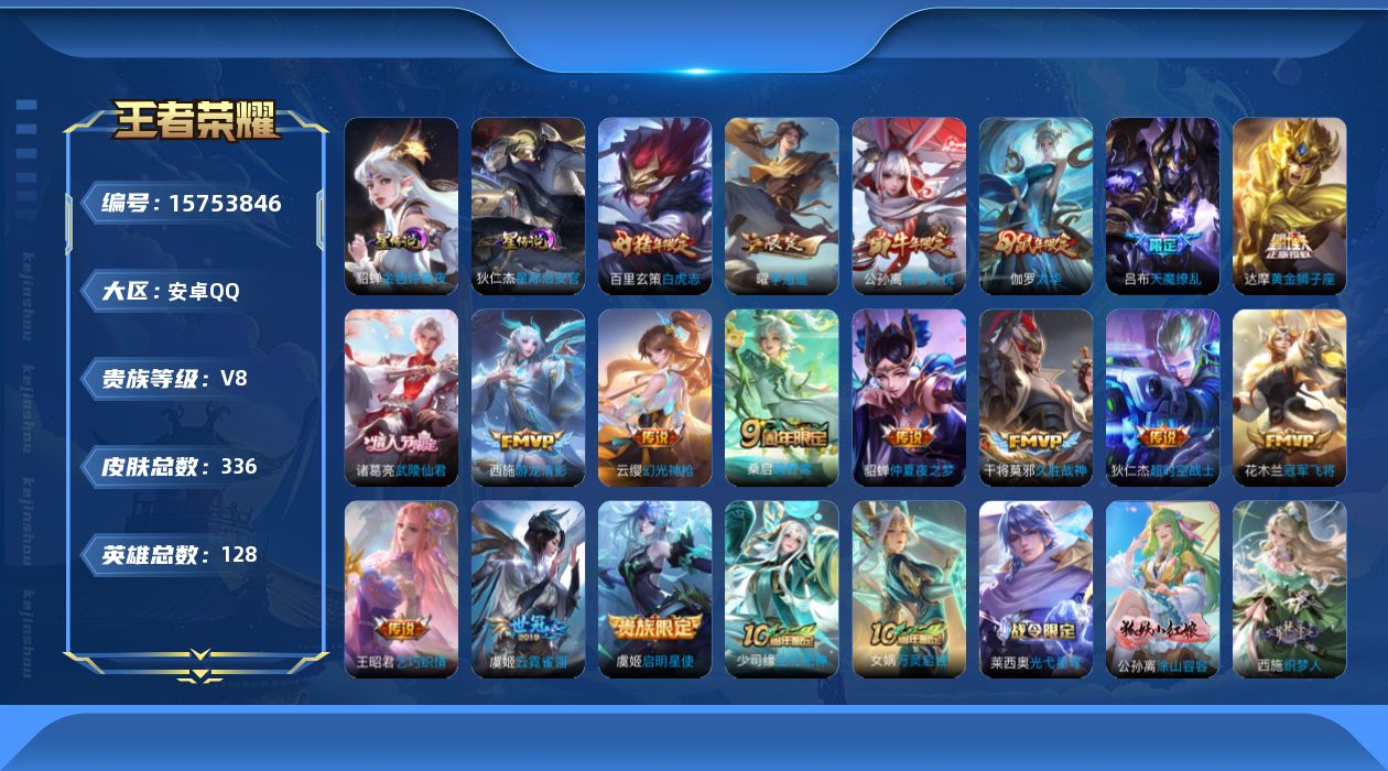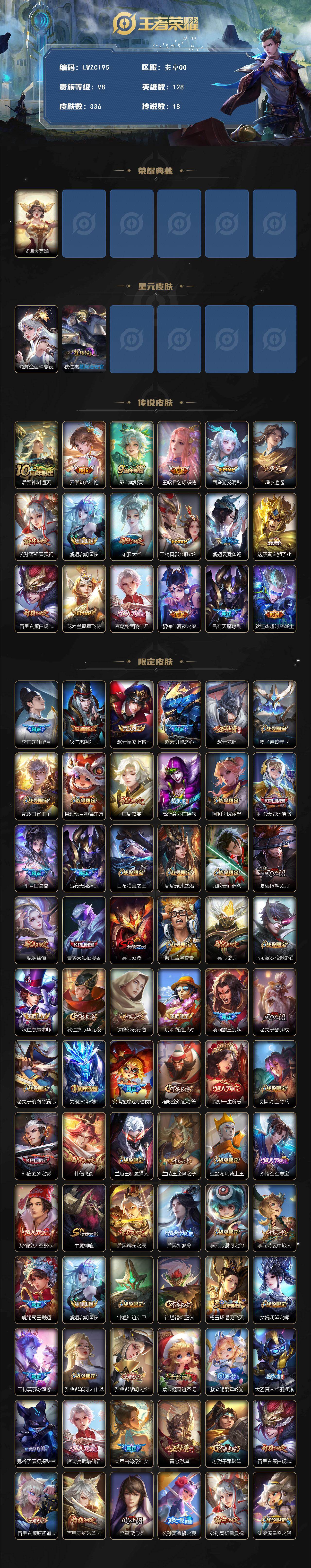 [15753846]【特价出售/店主推荐/2省标/3市标】:安卓Q-V8-至尊星耀IV段位-128英雄-336皮肤-1典藏英雄-2星元-18传说-108史诗