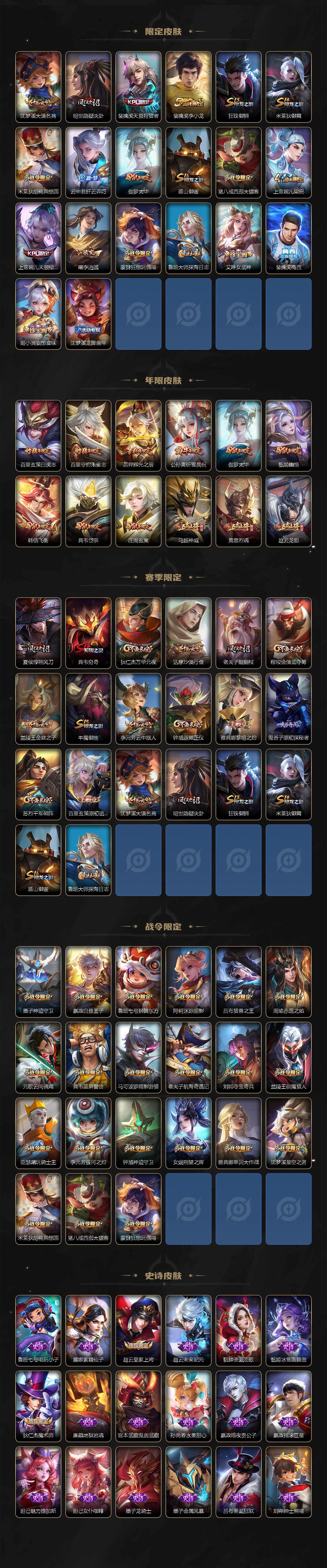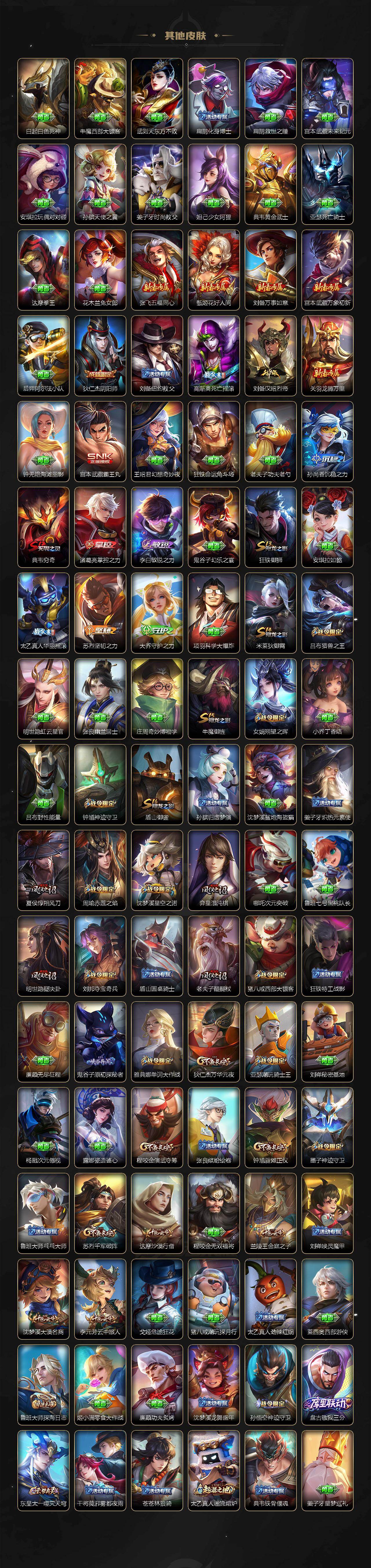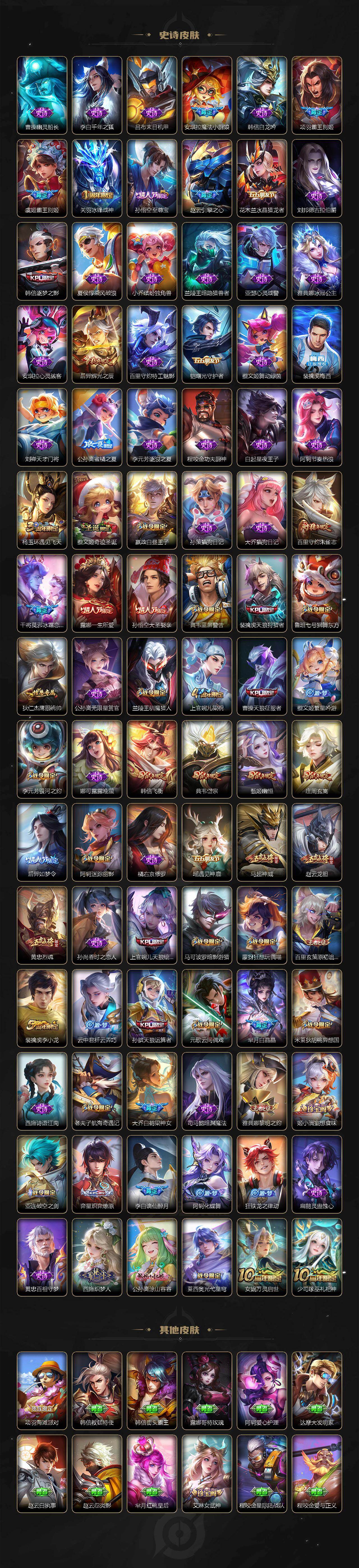 【限定皮肤】:李白谪仙醉月,狄仁杰阴阳师,赵云皇家上将,赵云引擎之心,赵云龙胆,墨子神迹守卫,嬴政白昼王子,鲁班七号狮舞东方,庄周玄嵩,高渐离死亡摇滚,阿轲迷踪丽影,孙膑天狼运算者,芈月白晶晶,吕布天魔缭乱,吕布猎兽之王,周瑜赤莲之焰,元歌云间偶戏,夏侯惇朔风刀,甄姬幽恒,曹操天狼征服者,典韦穷奇,典韦蓝屏警告,典韦岱宗,马可波罗暗影游猎,狄仁杰魔术师,狄仁杰万华元夜,达摩沙漠行僧,项羽海滩派对,项羽霸王别姬,老夫子醍醐杖,老夫子航海奇遇记,关羽冰锋战神,安琪拉魔法小厨娘,程咬金演武夺筹,露娜一生所爱,刘邦夺宝奇兵,韩信逐梦之影,韩信飞衡,兰陵王驯魔猎人,兰陵王金庭之子,亚瑟潮玩骑士王,孙悟空至尊宝,孙悟空大圣娶亲,牛魔御旌,后羿辉光之辰,后羿如梦令,李元芳银河之约,李元芳云中旅人,虞姬霸王别姬,虞姬启明星使,钟馗神迹守卫,钟馗驱傩正仪,杨玉环遇见飞天,女娲朔望之晖,干将莫邪冰霜恋舞曲,雅典娜单词大作战,雅典娜黎明之约,蔡文姬奇迹圣诞,蔡文姬繁星吟游,太乙真人华丽摇滚,鬼谷子原初探秘者,诸葛亮武陵仙君,大乔白鹤梁神女,黄忠烈魂,苏烈千军破阵,百里玄策白虎志,百里玄策原初追逐者,百里守约朱雀志,弈星混沌棋,公孙离蜜橘之夏,公孙离祈雪灵祝,沈梦溪星空之诺,沈梦溪大漠名商,明世隐疑决卦,裴擒虎天狼狩猎者,裴擒虎李小龙,狂铁御狮,米莱狄御霄,米莱狄胡桃异想国,云中君纤云弄巧,伽罗太华,盾山御銮,猪八戒西部大镖客,上官婉儿梁祝,上官婉儿天狼绘梦者,曜李逍遥 ,蒙犽狂想玩偶喵,鲁班大师探海日志,艾琳女武神,裴擒虎梅西,姬小满妄想食味,沈梦溪龙舞盛年