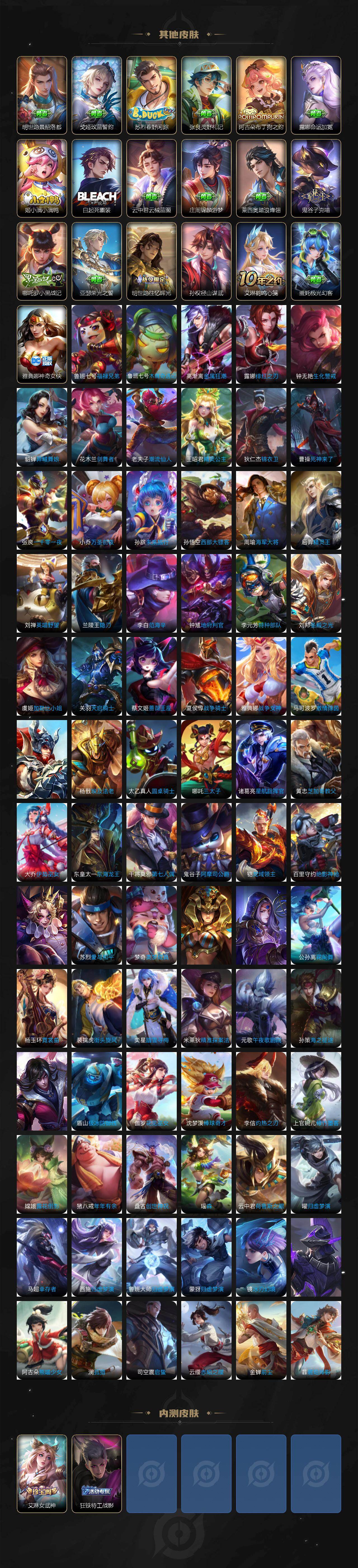 瑶遇见神鹿,娜可露露晚萤,李元芳逐浪之夏,公孙离无限星赏官,大乔猫狗日记,孙策猫狗日记,阿轲节奏热浪,露娜紫霞仙子,韩信白龙吟,孙尚香时之恋人,雅典娜冰冠公主,吕布末日机甲,鲁班七号电玩小子,橘右京修罗,墨子龙骑士,嬴政摇滚巨星,刘禅绅士熊喵,刘禅天才门将,白起星夜王子,安琪拉心灵骇客,程咬金功夫厨神,刘邦德古拉伯爵,兰陵王暗隐猎兽者,曹操幽灵船长,宫本武藏鬼剑武藏,司马懿暗渊魔法,亚瑟心灵战警,蔡文姬舞动绿茵,廉颇地狱岩魂,西施诗语江南,小乔缤纷独角兽,夏侯惇乘风破浪,花木兰水晶猎龙者,铠曙光守护者,墨子金属风暴,百里玄策原初追逐者,吕布圣诞狂欢,貂蝉圣诞恋歌,百里守约特工魅影,嬴政暗夜贵公子,雅典娜黎明之约,李白千年之狐,李白谪仙醉月