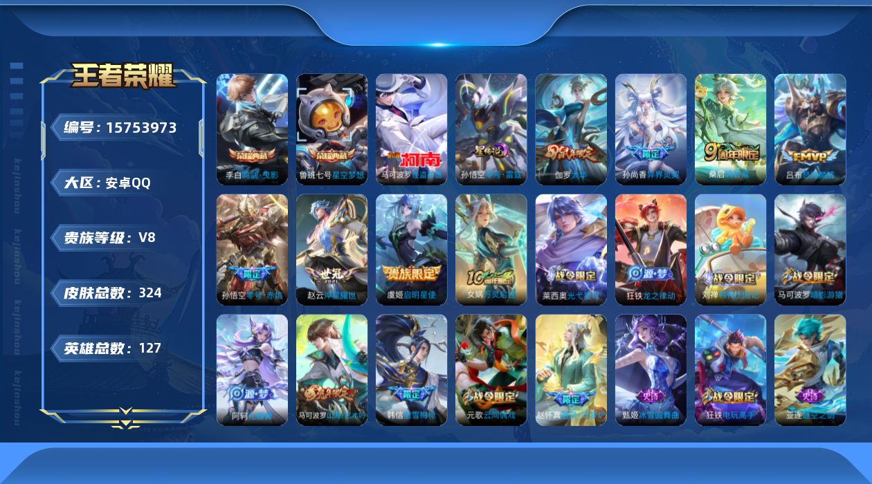 [15753973]【店主推荐捡漏号!可直接换绑】安卓Q-V8-最强王者段位-127英雄-324皮肤-2典藏皮肤-1珍品传说-8传说-90史诗-1星元